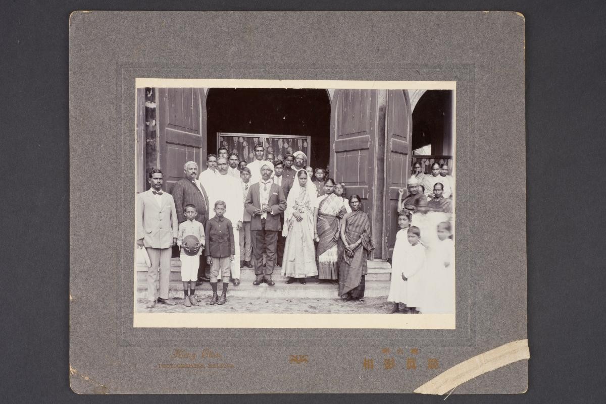 This group photograph shows a Peranakan groom and bride in western wedding attire. This large group of photographs provides important visual documentation of the fashion, studio photography and lifestyle of Peranakans of the Straits Settlements and Indonesia in the late 19th to mid-20th centuries. The collection also allows study of different photographic techniques and covers a wide range of themes, including changing fashions (from baju panjang and baju kurong to kebaya and cheongsam), festive celebrations (weddings, funerals, ancestral rites, Chinese New Year), interiors, transportation and children.