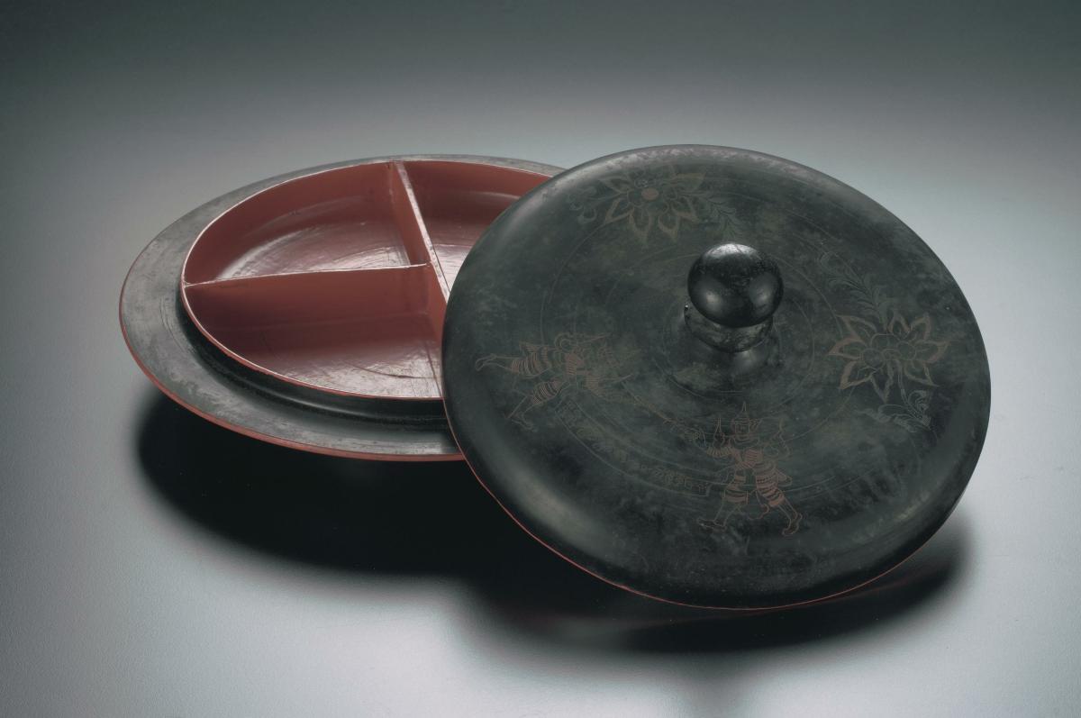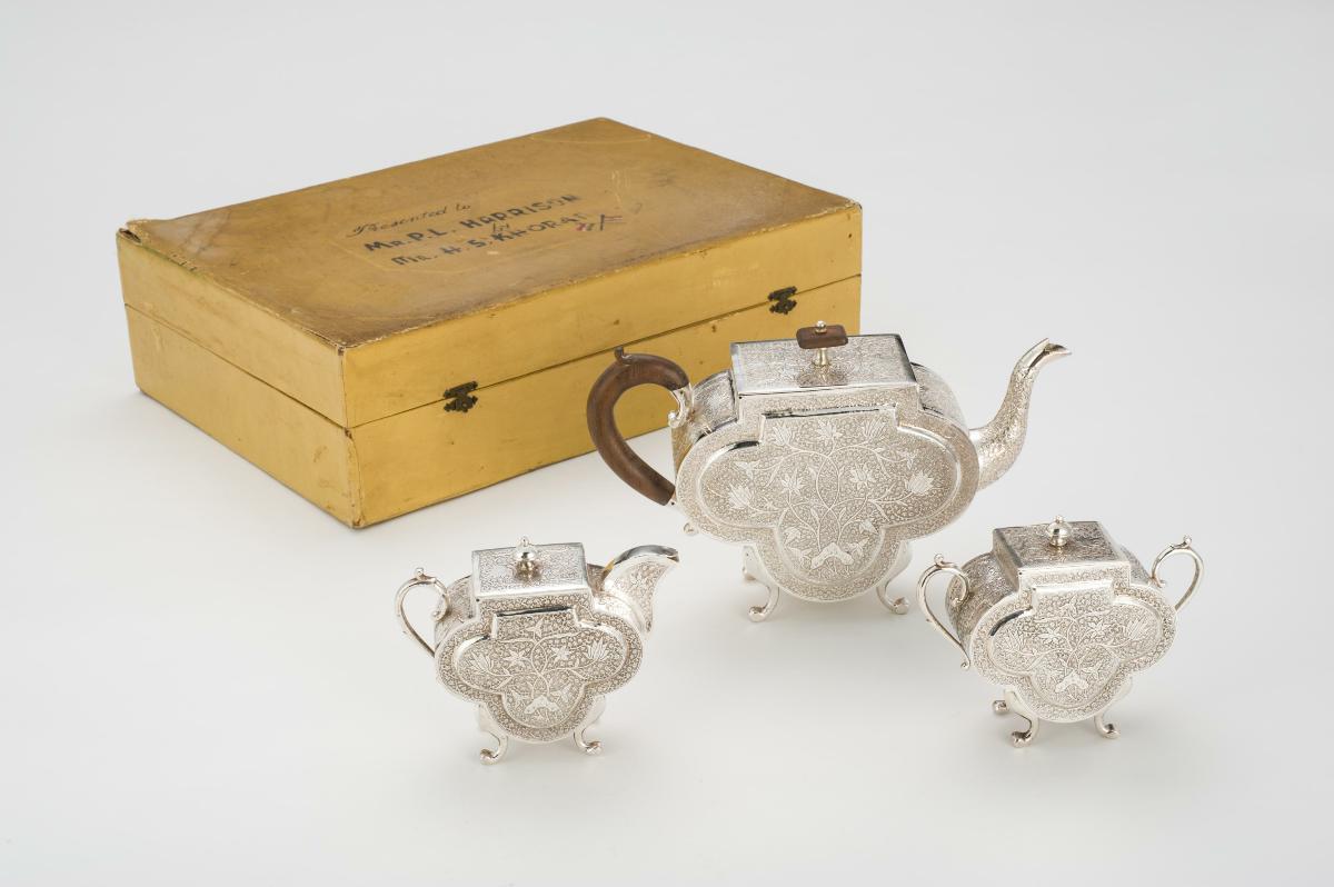 In its original box, this silver tea service, comprising a teapot, sugar bowl, and milk jug, was made at the Lee Ching Gold and Silver Smith located in Sai Hing Street in Guangzhou. Each vessel is finely worked in repoussé, with scholars and attendants in landscapes and, more unusually, martial scenes. Shield-shaped cartouches are engraved with the initials IH, for the name of the owner.Chinese silversmiths began to produce large amounts of silver for the Western market at the end of the eighteenth century. Near the end of the Opium War in 1842, the expansion of foreign trading rights in China led to a boom in silver crafts.
