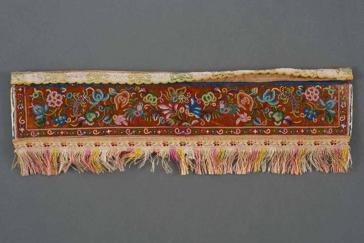 The gold wrapped thread and beaded panel is decorated with animals and flowers. At the centre of the panel is an ogival medallion containing a pair of pink and blue fish, symbolizing wealth and abundance in Chinese art. A pair of phoenixes and a large rooster also decorates the panel, as well as large peonies. Beaded panels like this would have been likely commissioned as part of the Peranakan wedding.