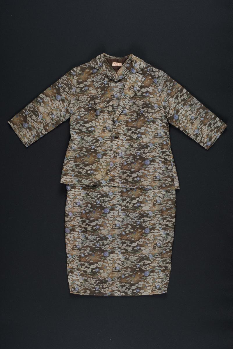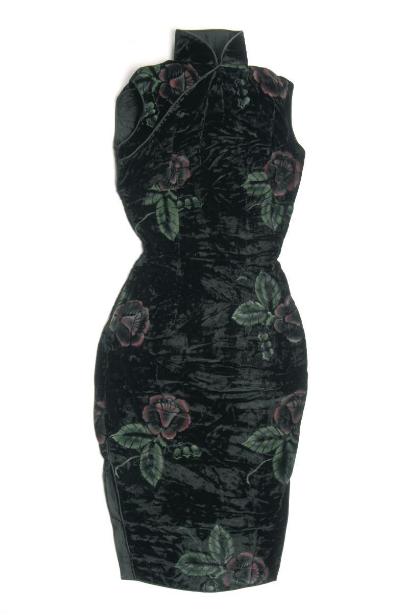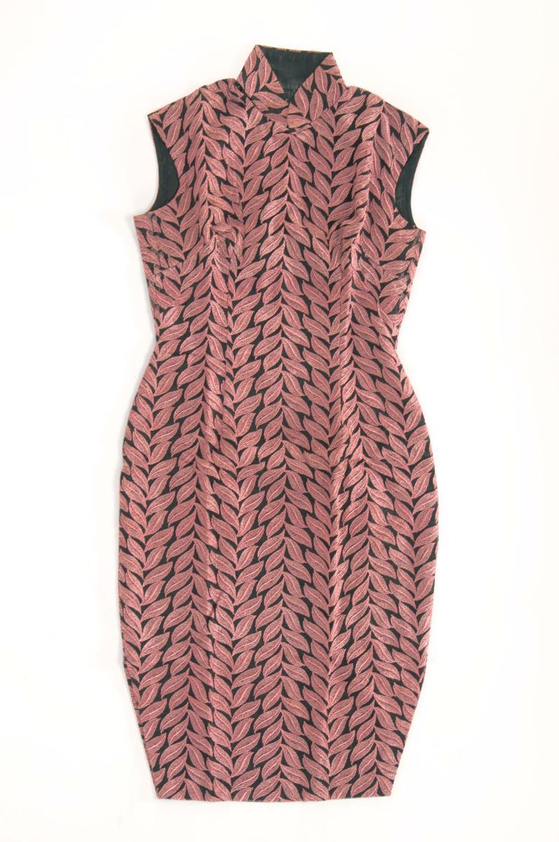 This is a black silk cheongsam with leaf motif that has a matching jacket. Cheongsams with matching jackets were usually worn at more formal occasions.
