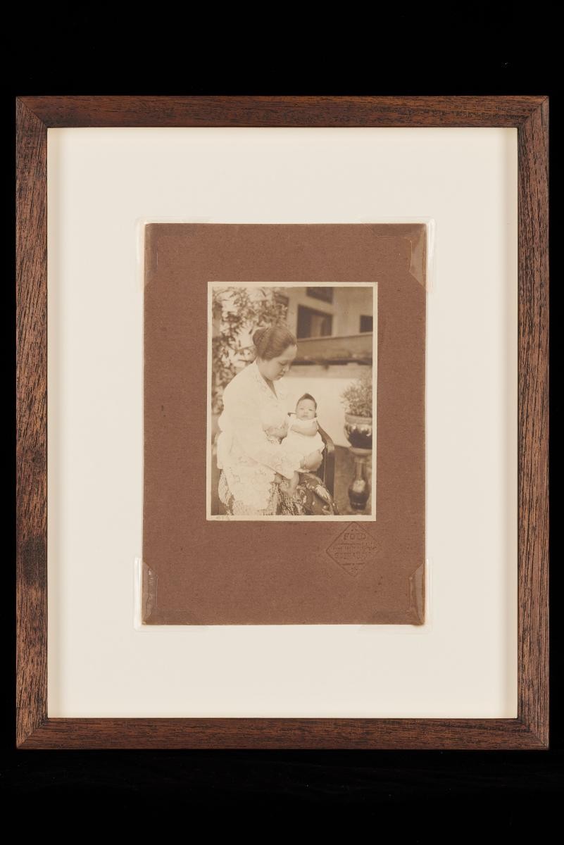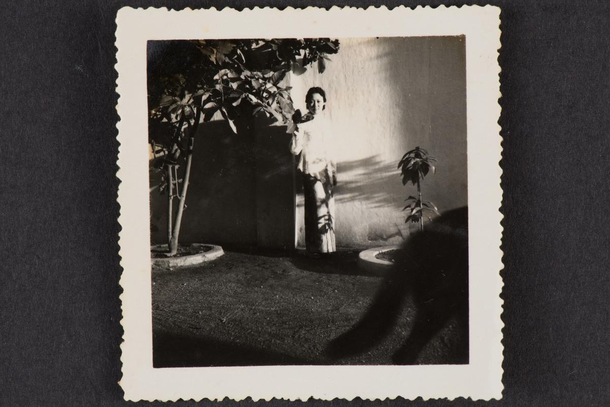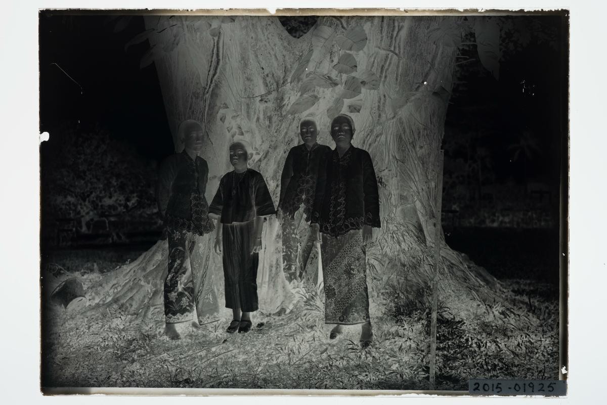 This photograph shows a nyonya in in sarong kebaya under a tree.This large group of photographs provides important visual documentation of the fashion, studio photography and lifestyle of Peranakans of the Straits Settlements and Indonesia in the late 19th to mid-20th centuries. The collection also allows study of different photographic techniques and covers a wide range of themes, including changing fashions (from baju panjang and baju kurong to kebaya and cheongsam), festive celebrations (weddings, funerals, ancestral rites, Chinese New Year), interiors, transportation and children.