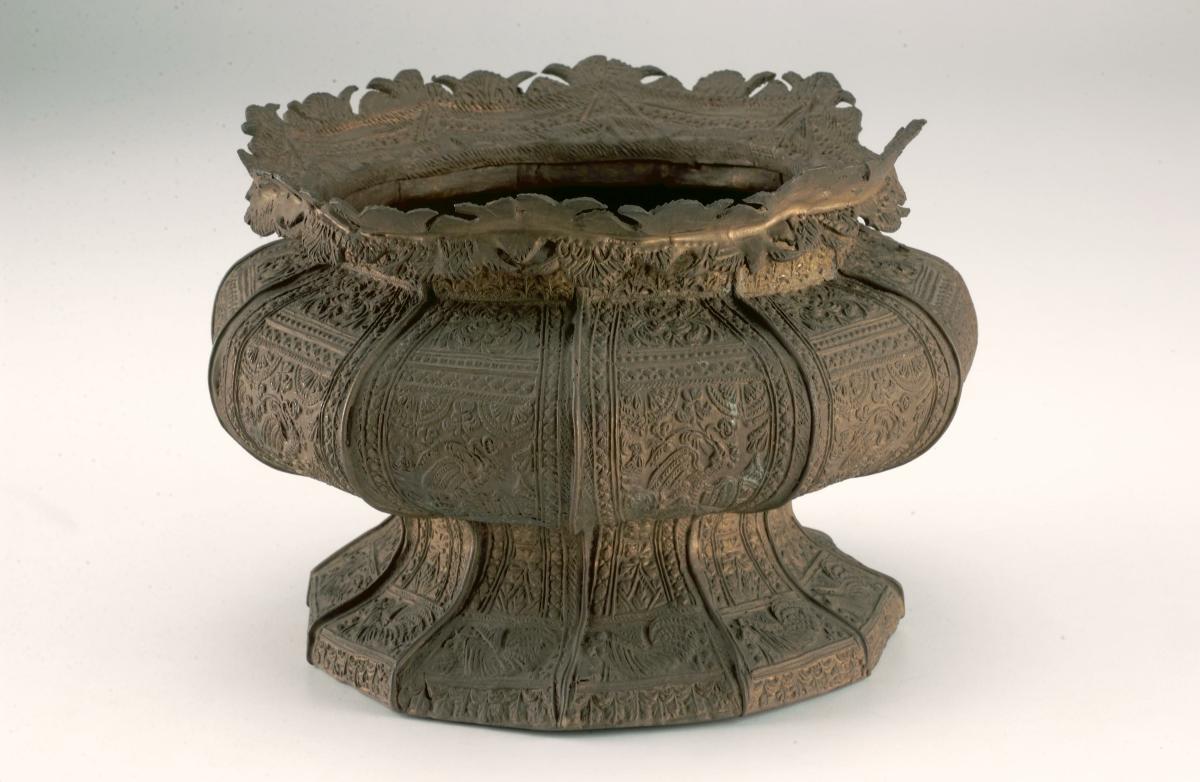 These two bowls illustrate the cross-cultural influence of Chinese export ware. While the Chinese became experts at crafting objects catered to the taste and demands of foreign markets, they nonetheless transferred cultural peculiarities in the stylistic features of objects they produced. In this case, the shape of the bowl is a commonly associated Chinese shape that subsequently became one of the most common shapes to be exported to many countries in Southeast Asia. Two motifs feature on both bowls. First, the rajasingh, a name derived from Sanskrit words raja (“king”) and singh (“lion”) and thus this motif on Bencharong was reserved for exclusive use by the King. The motif resembles a Chinese lion with its fearsome look, standing in profile with a flame-like tail, aping mouth with pointed teeth and spikey mane. The singhakala, a protector in both Buddhist and Hindu mythology, is an abstractly drawn lion face. As the name suggests, it is a composite of a lion and a kala, a creature with a fierce, mask-like face, horns, bulging eyes, lion’s nose and a gaping mouth with teeth. The face is set into an oval medallion and is depicted as surrounded by flames, suggesting the power to scare away evil spirits.