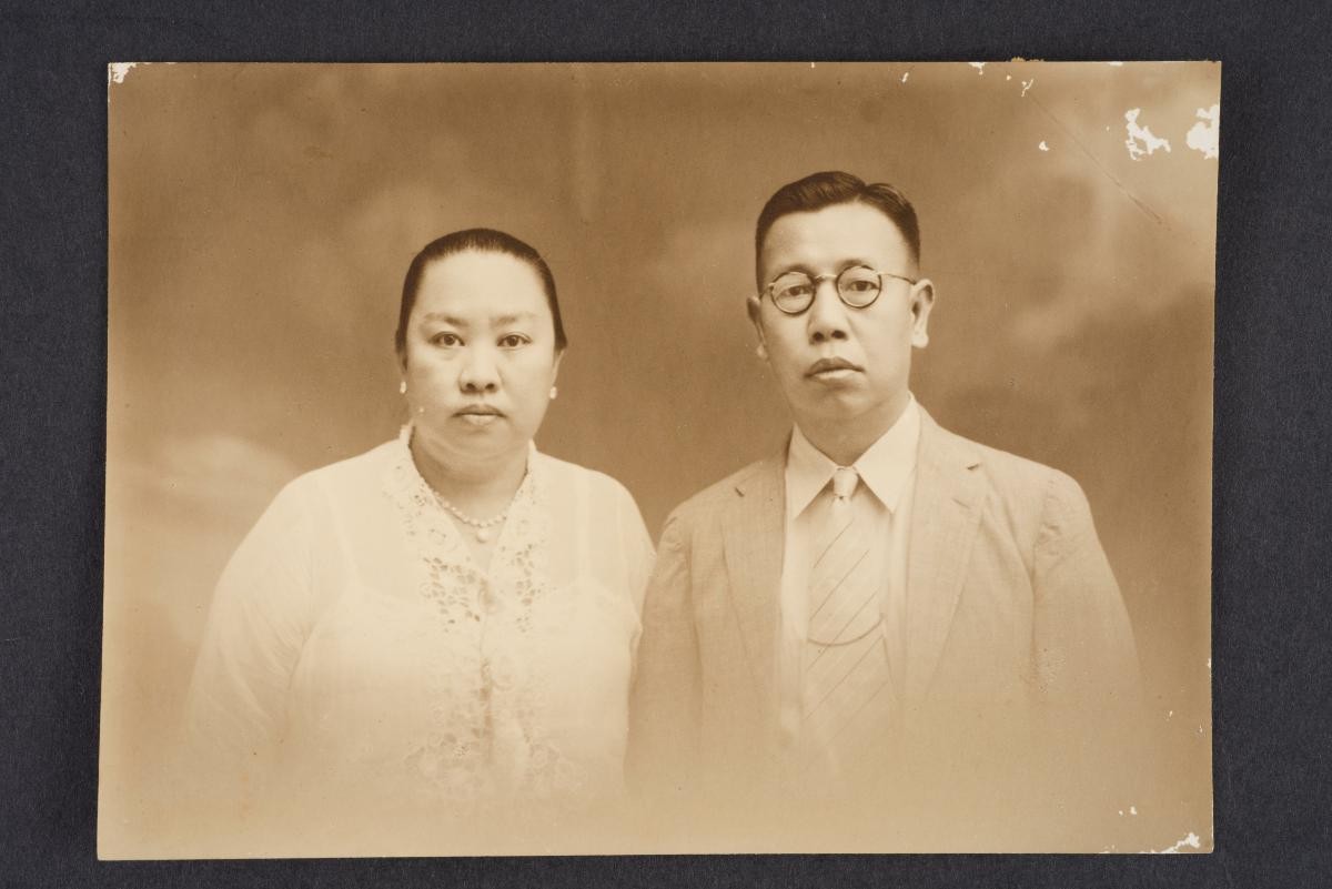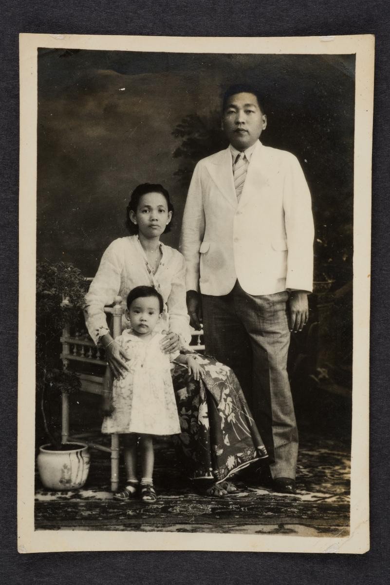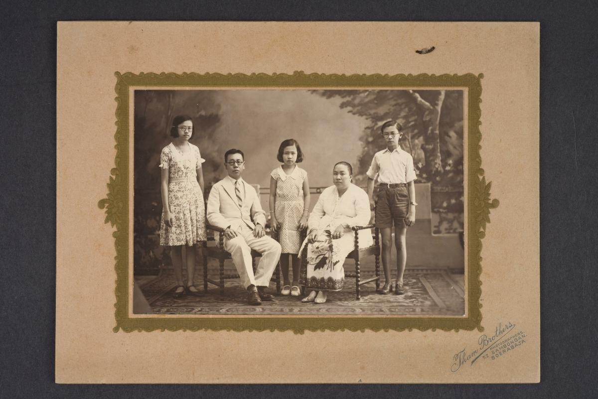 This studio portrait of a Peranakan family shows a woman in sarong kebaya and children and man in western dress. On the verso is the studio mark of ‘Lie Yauw Ming’. This large group of photographs provides important visual documentation of the fashion, studio photography and lifestyle of Peranakans of the Straits Settlements and Indonesia in the late 19th to mid-20th centuries. The collection also allows study of different photographic techniques and covers a wide range of themes, including changing fashions (from baju panjang and baju kurong to kebaya and cheongsam), festive celebrations (weddings, funerals, ancestral rites, Chinese New Year), interiors, transportation and children.