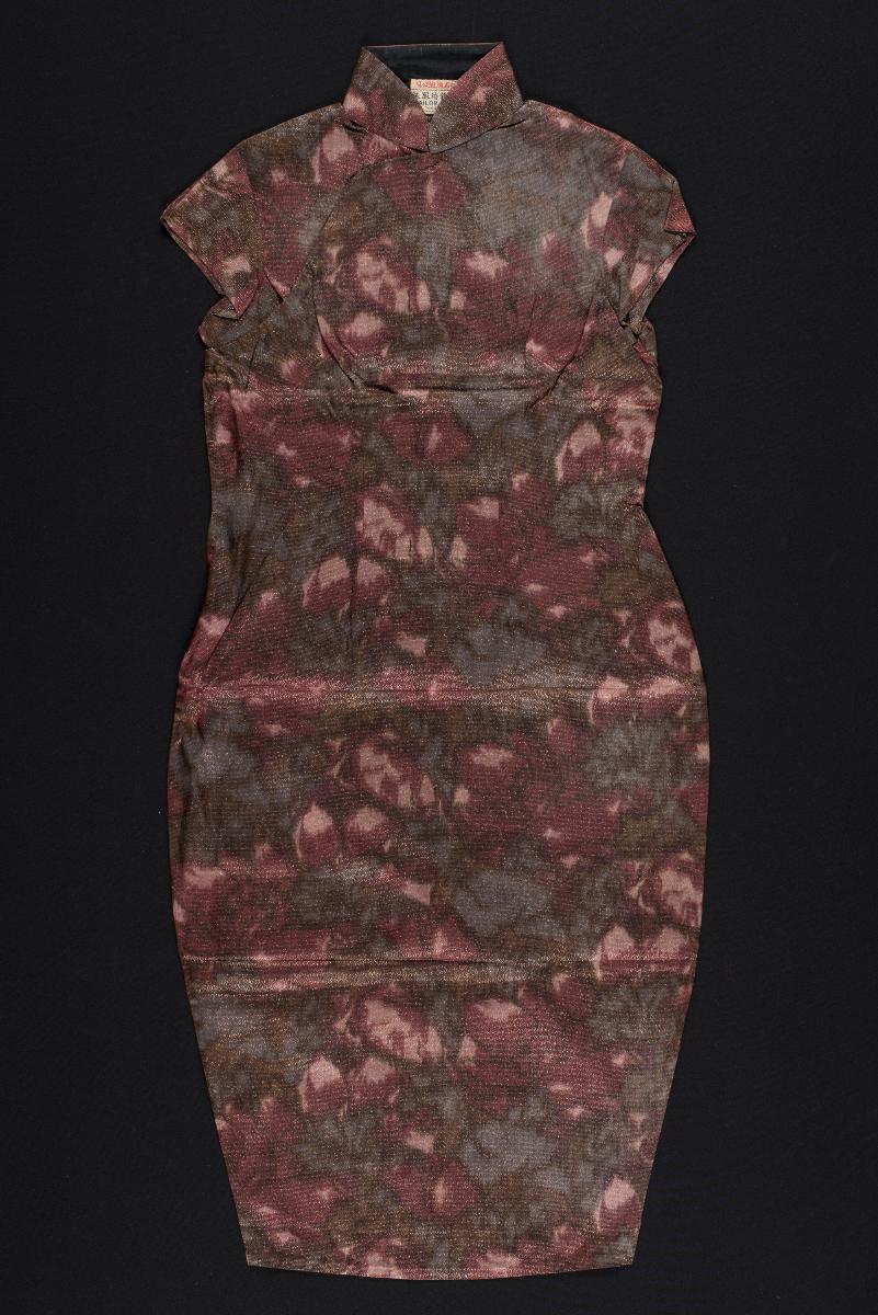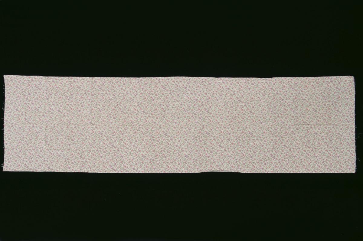 This is a piece of pink silk fabric decorated with flower and lozenge patterns. A piece of paper with ‘圣合系,申足, 纺白, 祝和祥 ‘ is perhaps a clue to its source. It is part of a donation which contains a mixture of materials used in the making of kebayas and baju panjangs.