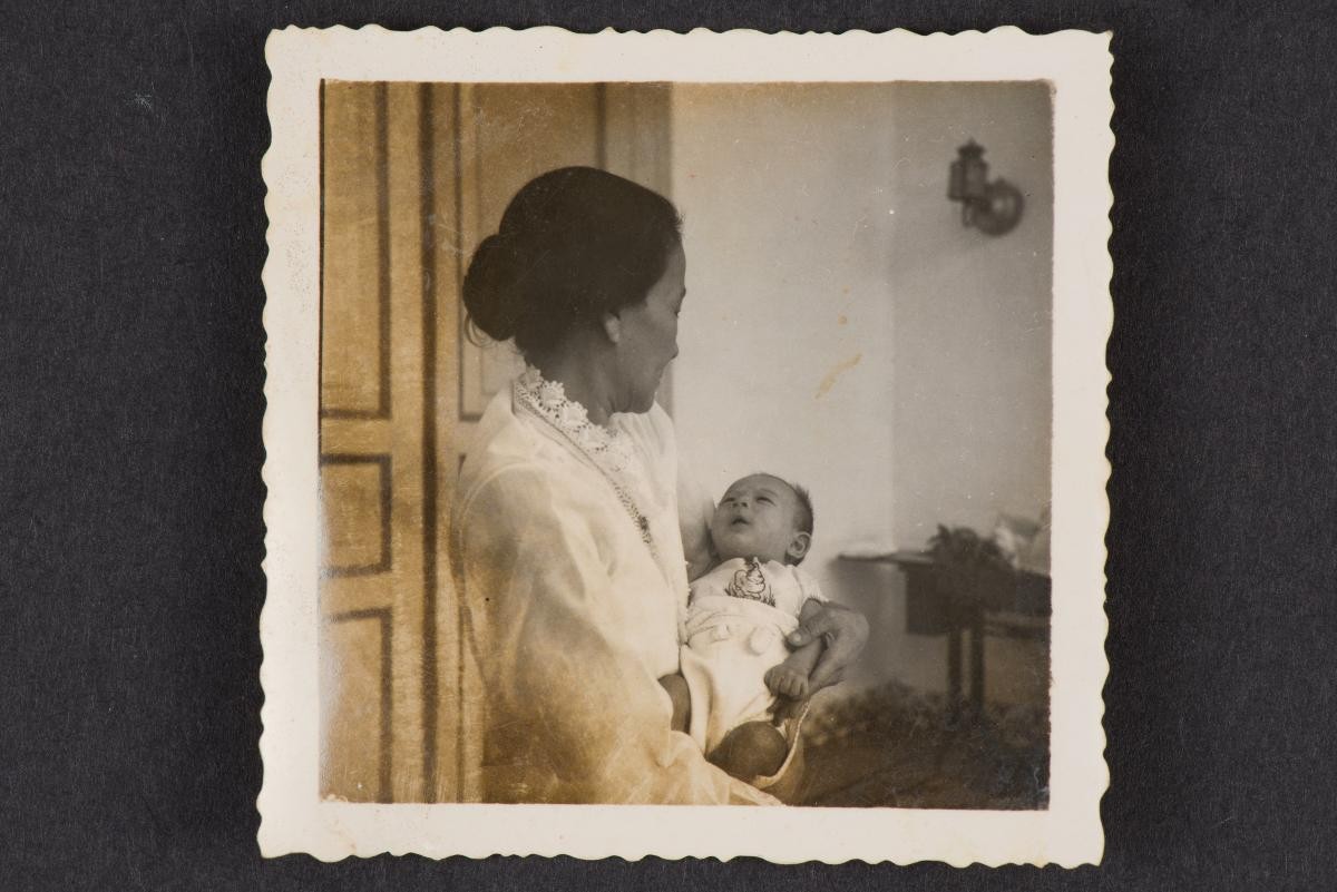 This photograph shows a nyonya in sarong kebaya carrying a baby. This large group of photographs provides important visual documentation of the fashion, studio photography and lifestyle of Peranakans of the Straits Settlements and Indonesia in the late 19th to mid-20th centuries. The collection also allows study of different photographic techniques and covers a wide range of themes, including changing fashions (from baju panjang and baju kurong to kebaya and cheongsam), festive celebrations (weddings, funerals, ancestral rites, Chinese New Year), interiors, transportation and children.
