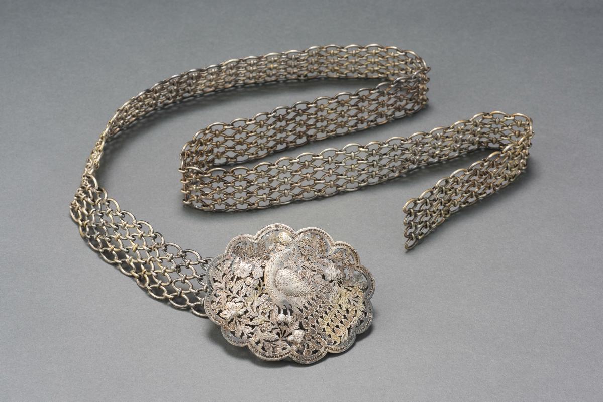 This elaborate gold and diamond peacock belt is from Singapore. It comprises 18 linked gold panels containing, in total, 75 carats of diamonds including a central diamond that weighs over 5 carats. The peacock, traditionally an Indian motif, is the main design in each panel of the belt. Enhancing the design are the exotic colours of the diamonds, which include shades of yellow, brown and orange-pink. Peranakans distinguish between brilliant diamonds like the ones in this belt, known as berlian, from lesser quality diamonds known as intan, which were still prized but not as highly.