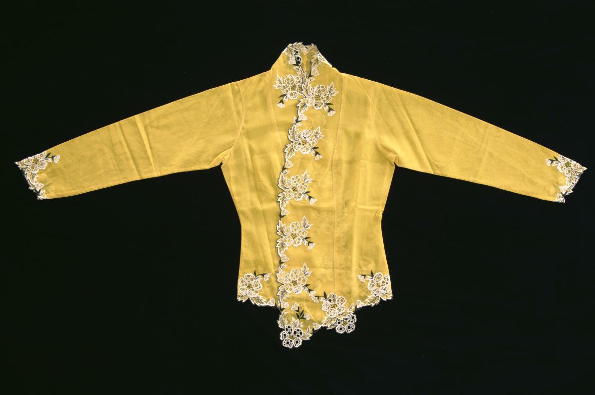 This kebaya has scalloped borders edged with small red flower embroidery. The checked fabric is double-faced and features red dot details. Kebayas with elongated tapered ends were popular in the 1930s and many were commissioned by Peranakan women. It is part of a donation which contains a mixture of garments worn by Peranakan men and women.