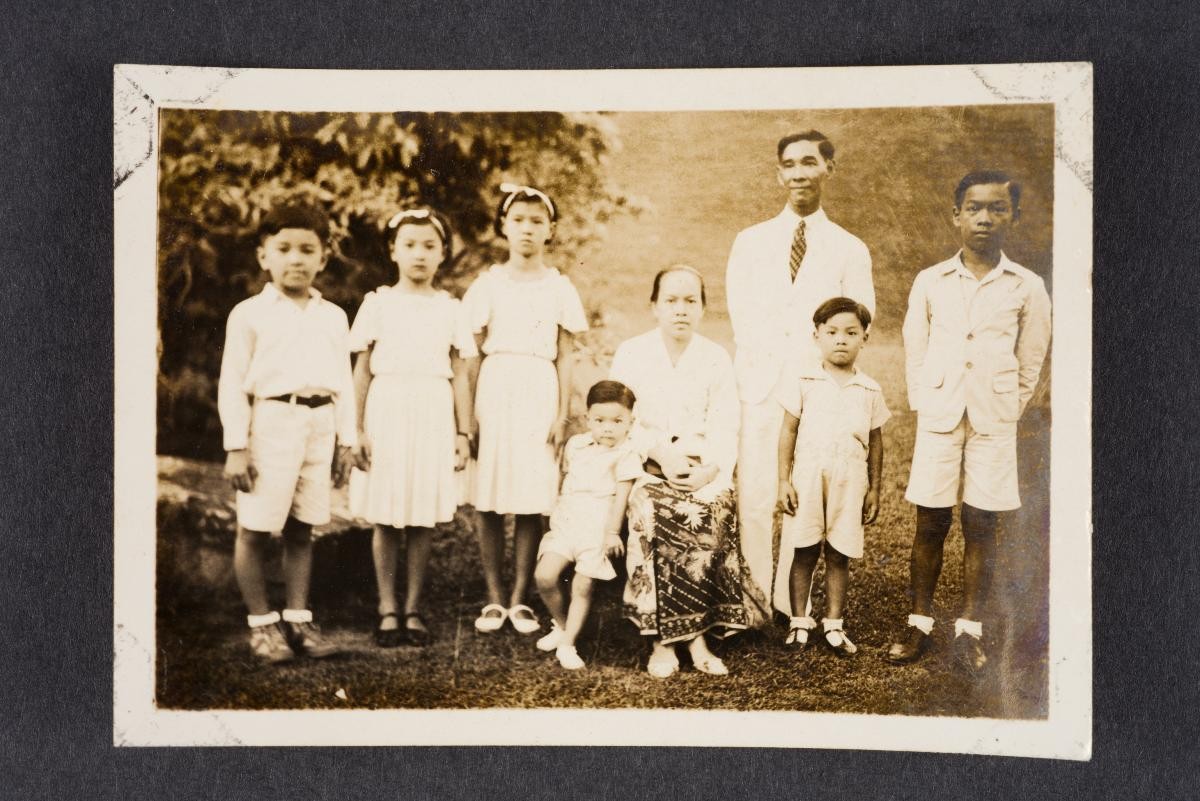 This photograph shows a group of Peranakans. The date "(?) 16/8 37" is inscribed on the back of the photograph. This large group of photographs provides important visual documentation of the fashion, studio photography and lifestyle of Peranakans of the Straits Settlements and Indonesia in the late 19th to mid-20th centuries. The collection also allows study of different photographic techniques and covers a wide range of themes, including changing fashions (from baju panjang and baju kurong to kebaya and cheongsam), festive celebrations (weddings, funerals, ancestral rites, Chinese New Year), interiors, transportation and children.