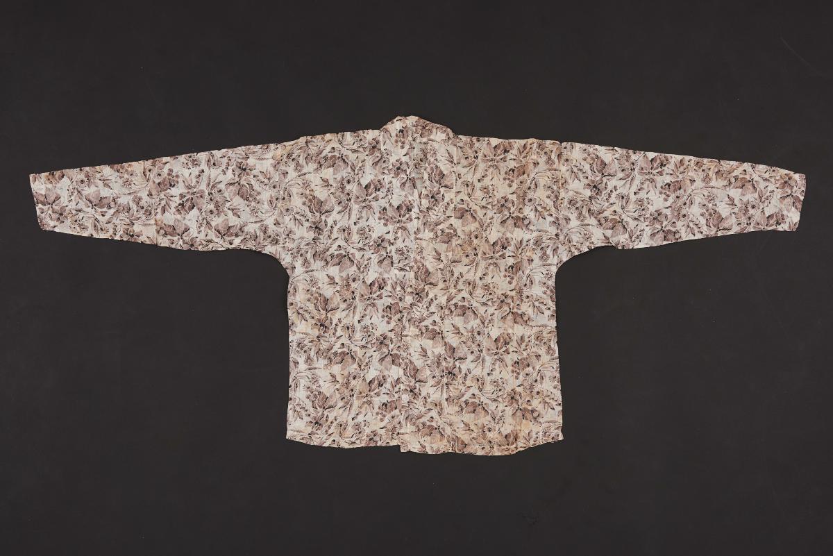 This kebaya is decorated with sprays of flowers both down the front and behind. Accents of smaller blooms adorn the edges. The fabric is stippled with salmon pink and green dots. Kebayas with elongated tapered ends were popular in the 1930s and many were commissioned by Peranakan women. It is part of a donation which contains a mixture of garments worn by Peranakan men and women.