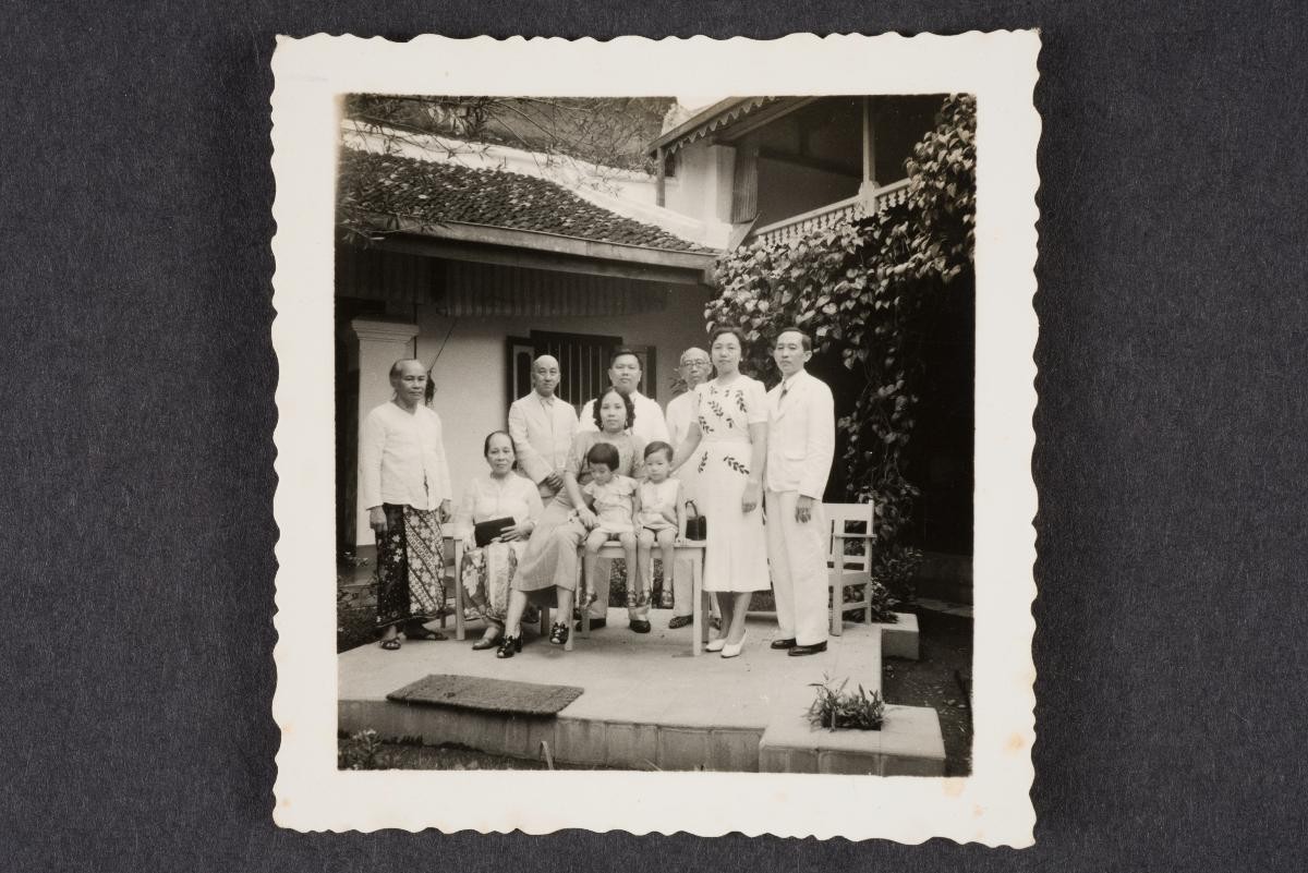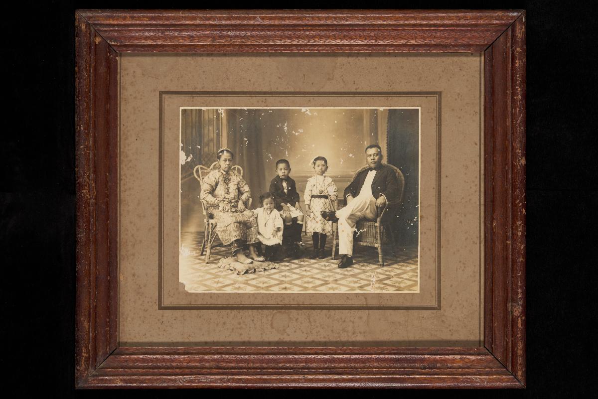 This is a studio portrait of a Peranakan family with three children.This large group of photographs provides important visual documentation of the fashion, studio photography and lifestyle of Peranakans of the Straits Settlements and Indonesia in the late 19th to mid-20th centuries. The collection also allows study of different photographic techniques and covers a wide range of themes, including changing fashions (from baju panjang and baju kurong to kebaya and cheongsam), festive celebrations (weddings, funerals, ancestral rites, Chinese New Year), interiors, transportation and children.