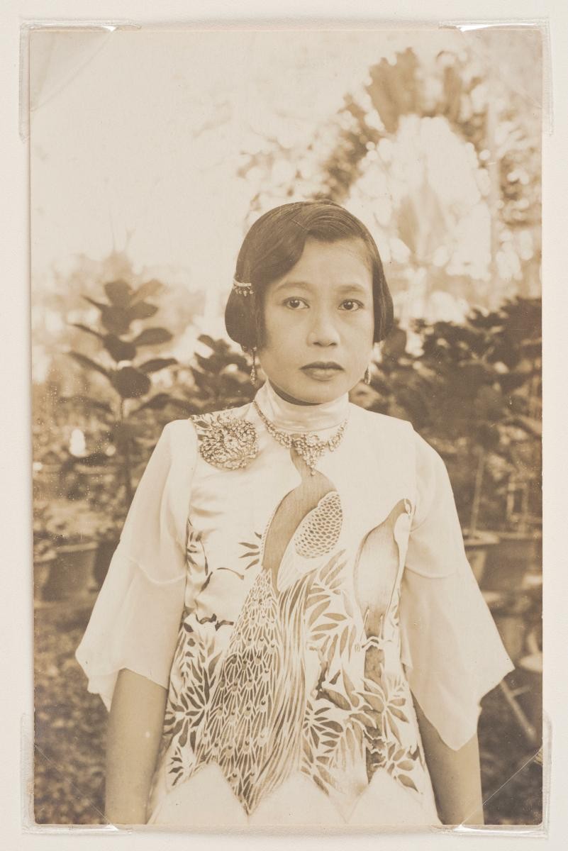This photograph shows a nyonya in sarong kebaya seated next to a table with potted plant. The caption of the photograph reads “Hmg (?) 20/9.21” and an inscription “20/9/21 Oe Moe (?) 46 / 191 2472” could be found on the back of the photograph. This large group of photographs provides important visual documentation of the fashion, studio photography and lifestyle of Peranakans of the Straits Settlements and Indonesia in the late 19th to mid-20th centuries. The collection also allows study of different photographic techniques and covers a wide range of themes, including changing fashions (from baju panjang and baju kurong to kebaya and cheongsam), festive celebrations (weddings, funerals, ancestral rites, Chinese New Year), interiors, transportation and children.