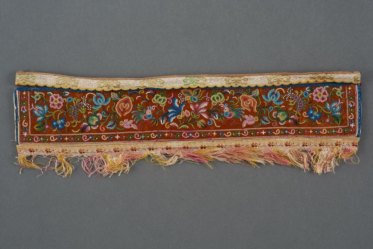 This beaded panel is highly unusual for the choice of grey as the base colour. A pot with three large roses, flanked by two white rabbits dominates the central design on the panel, surrounded by a border of smaller flowers and leaves.The technique employed to create a panel like this is known as netted beadwork. It is a technically demanding method of beading particularly popular with beadwork from Penang and Sumatra.