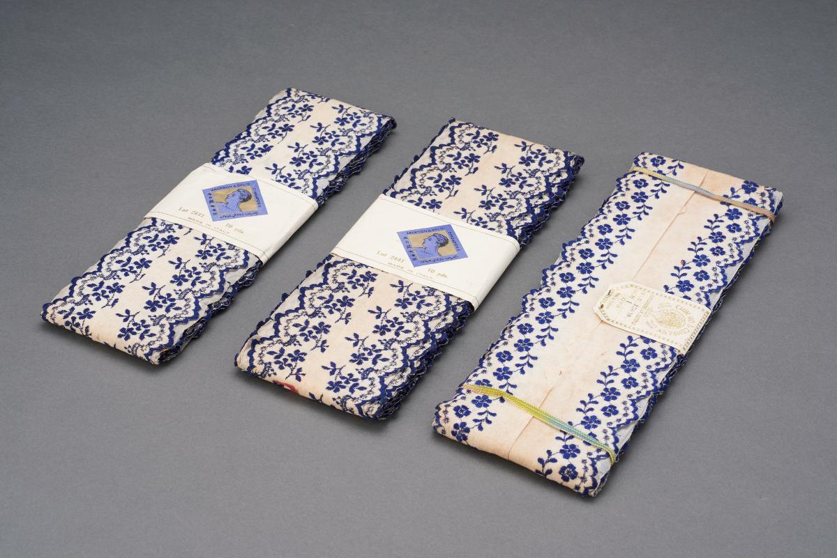 There are 2 rolls of lace of different design. The making of bobbin lace was an established tradition in port cities like Malacca and Palembang by the early 20th century. It is part of a donation which contains a mixture of materials used in the making of kebayas and baju panjangs.