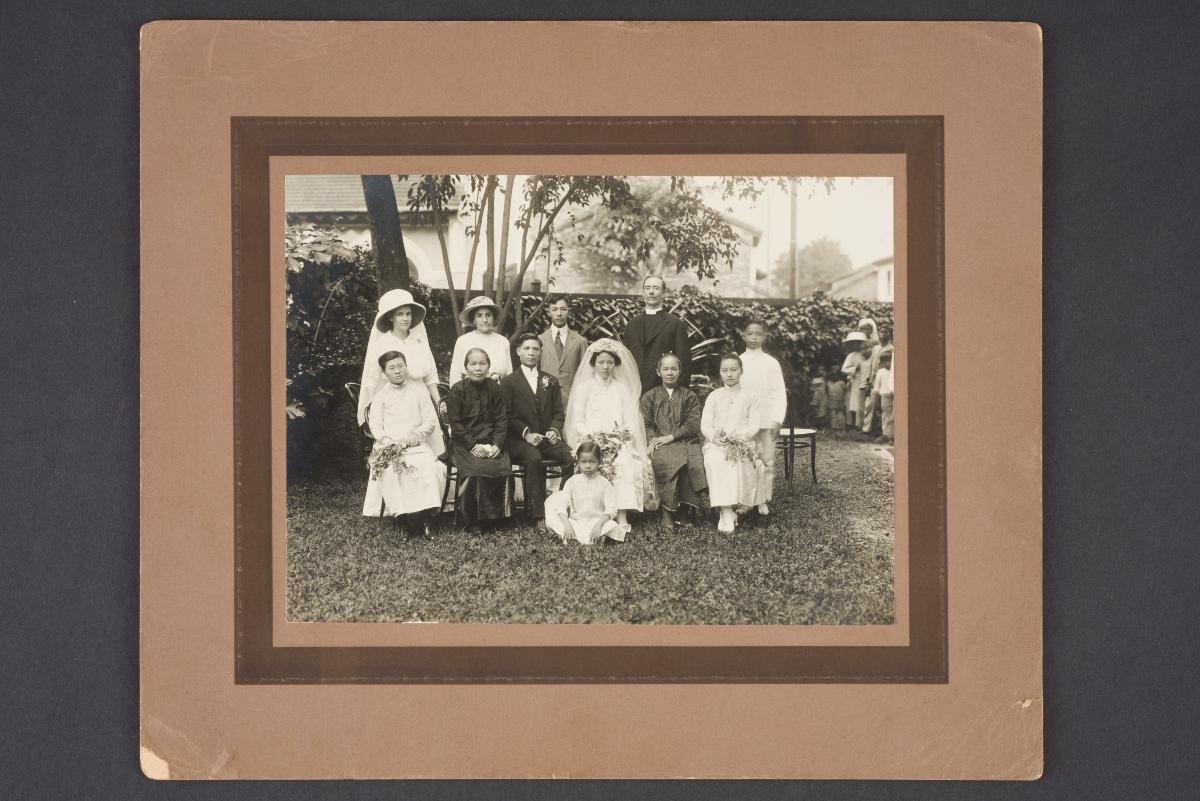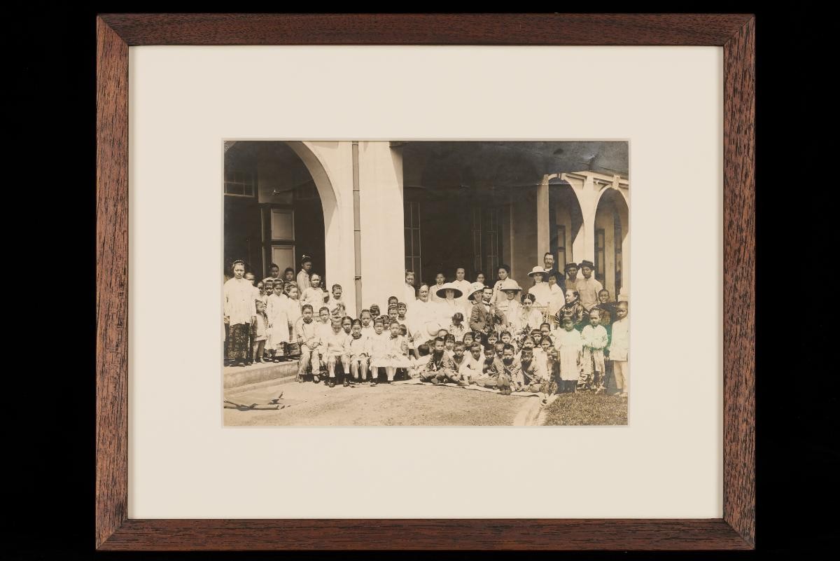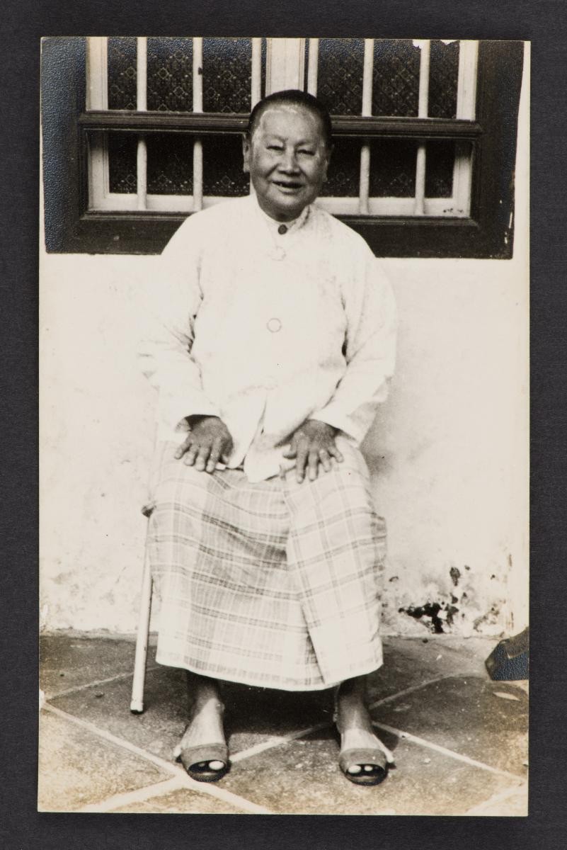 This photograph shows a group of people sitting around a table with a padded wall in the back. This large group of photographs provides important visual documentation of the fashion, studio photography and lifestyle of Peranakans of the Straits Settlements and Indonesia in the late 19th to mid-20th centuries. The collection also allows study of different photographic techniques and covers a wide range of themes, including changing fashions (from baju panjang and baju kurong to kebaya and cheongsam), festive celebrations (weddings, funerals, ancestral rites, Chinese New Year), interiors, transportation and children.