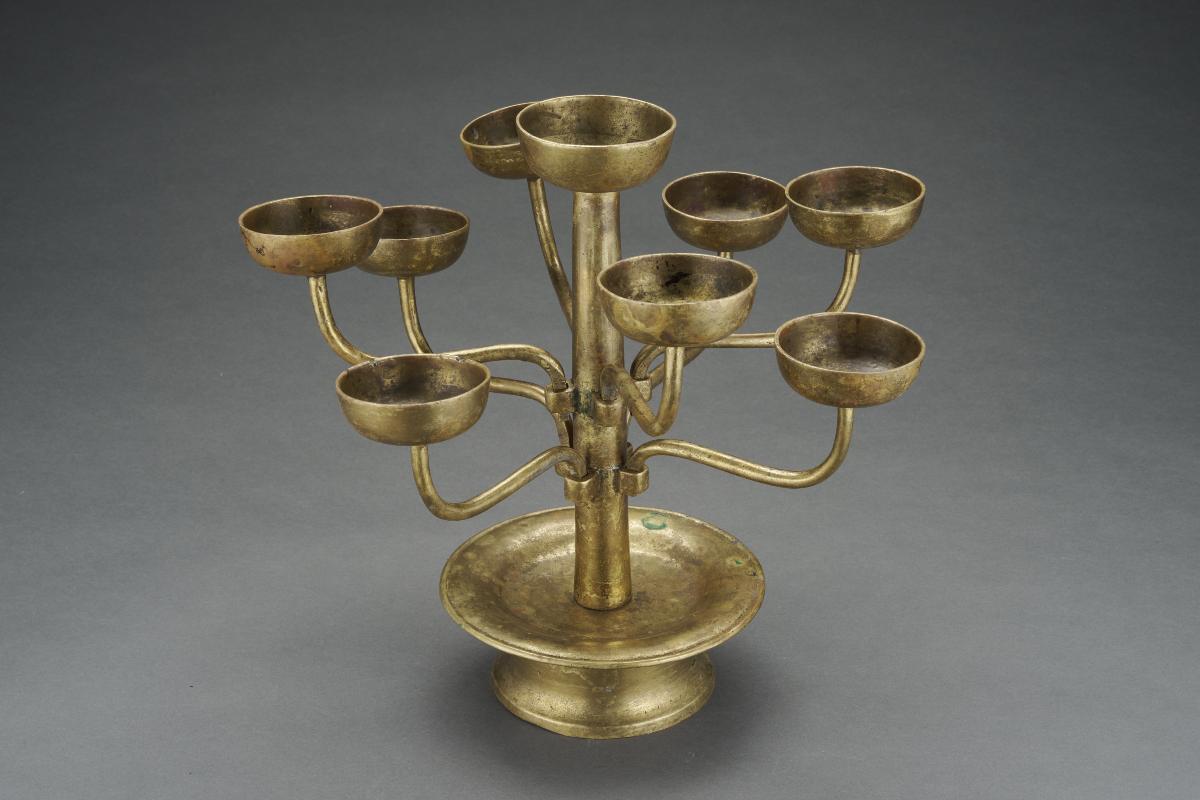 This branched holder for candles (called a candelabrum or candelabra) is decorated with bright enamels. The double-baluster stem supports five candleholders shaped like lotuses. Candelabra were made for dining tables in Europe and America. However, much of the design and decoration of this object is distinctly Chinese.The form of this candelabra was made in copper, which was then coated with pigments containing ground glass. The object was then fired to create a bright glassy coating. In the 18th century, this type was production for foreign export in Guangzhou (Canton), with the result that the type is often called Canton enamel.