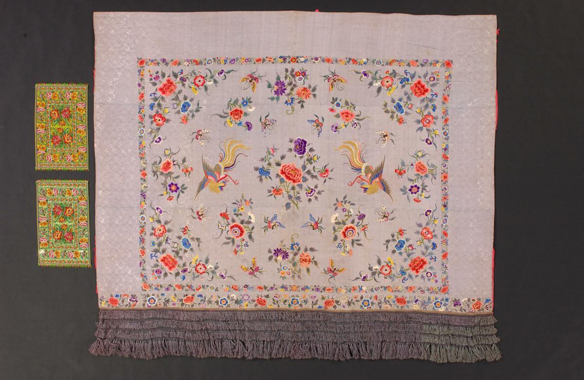 The double-headed eagle motif in the centre of this bedcover derives from the emblem of the Augustinian Order. This Catholic order established missions in Asian port cities, including Manila and Macao. Chinese silks like this were commissioned for a wide range of purposes – furnishing, clothing, and liturgical vestments – and their designs combine Chinese techniques and decorative elements with European motifs, often copied from European engravings. These silks were primarily made for Portugal and the rest of Europe.