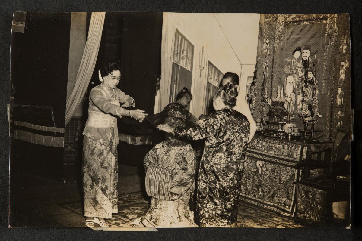 This is a personal album of photographs belonging to Francis Hogan, a well-known female impersonator of the 1950s revival of Wayang Peranakan (Peranakan theatre). The photos document important people and acting moments in his life, including his participation in some landmark plays, such as the Janda Kaya (The Wealthy Widow), alongside other well-known actors such as William Tan and Ong Chwee Kim. Wayang Peranakan is an example of the hybrid nature of Peranakan culture as it derives from an eclectic blend of Chinese Wayang and Malaya Bangsawan. It is commonly staged in the Baba patois and its origins can be traced to the early 20th century.