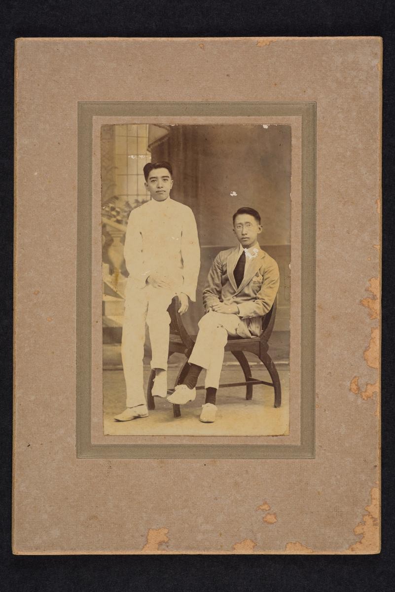 This photograph shows a man in suit and tie standing with crossed arms. On back reads "Taken on the 30th of Oct 1920/ Mr (?)", on the bottom left of the photograph is signed with "Sincerely yours (?)". This large group of photographs provides important visual documentation of the fashion, studio photography and lifestyle of Peranakans of the Straits Settlements and Indonesia in the late 19th to mid-20th centuries. The collection also allows study of different photographic techniques and covers a wide range of themes, including changing fashions (from baju panjang and baju kurong to kebaya and cheongsam), festive celebrations (weddings, funerals, ancestral rites, Chinese New Year), interiors, transportation and children.