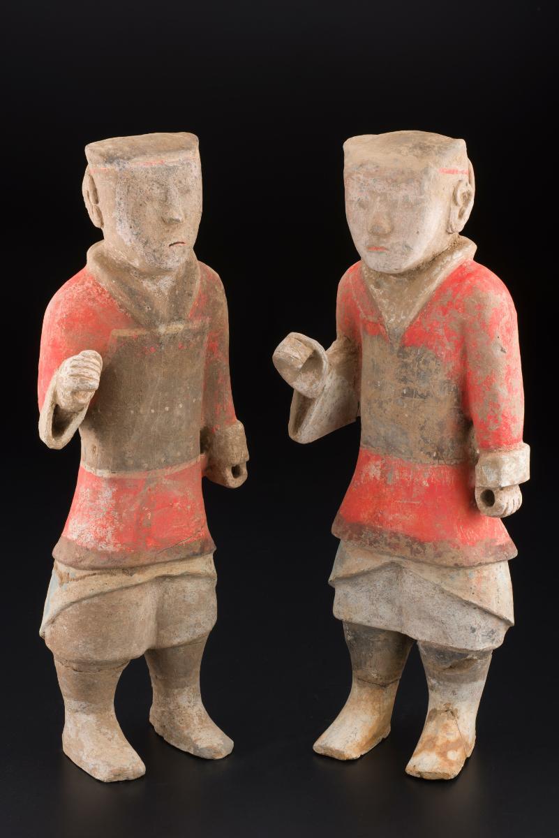 These painted clay figures were made in China for foreign traders. They were produced in response to the global fascination with all things Chinese. Similar figures entered the British royal collection in the 18th century. Probably made in Guangzhou, the figures could depict Chinese of various classes, as well as European and (more rarely) Indian traders.The careful painting of the clay gives the figures an astonishing realism. The heads are mounted so that they rock back and forth; the type is often called “nodding-head figures”. The clothing and accessories of these examples are made of real silk, hair, and jewellery. The men wear rank badges to signify their status as mandarins. Unusually, the figures themselves are anatomically correct.