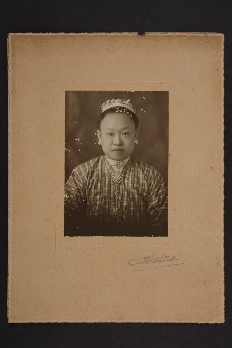 This is a studio portrait of a Peranakan couple, the man seated and the woman in sarong kebaya. The studio mark of Charls & Co could be found on the verso. This large group of photographs provides important visual documentation of the fashion, studio photography and lifestyle of Peranakans of the Straits Settlements and Indonesia in the late 19th to mid-20th centuries. The collection also allows study of different photographic techniques and covers a wide range of themes, including changing fashions (from baju panjang and baju kurong to kebaya and cheongsam), festive celebrations (weddings, funerals, ancestral rites, Chinese New Year), interiors, transportation and children.
