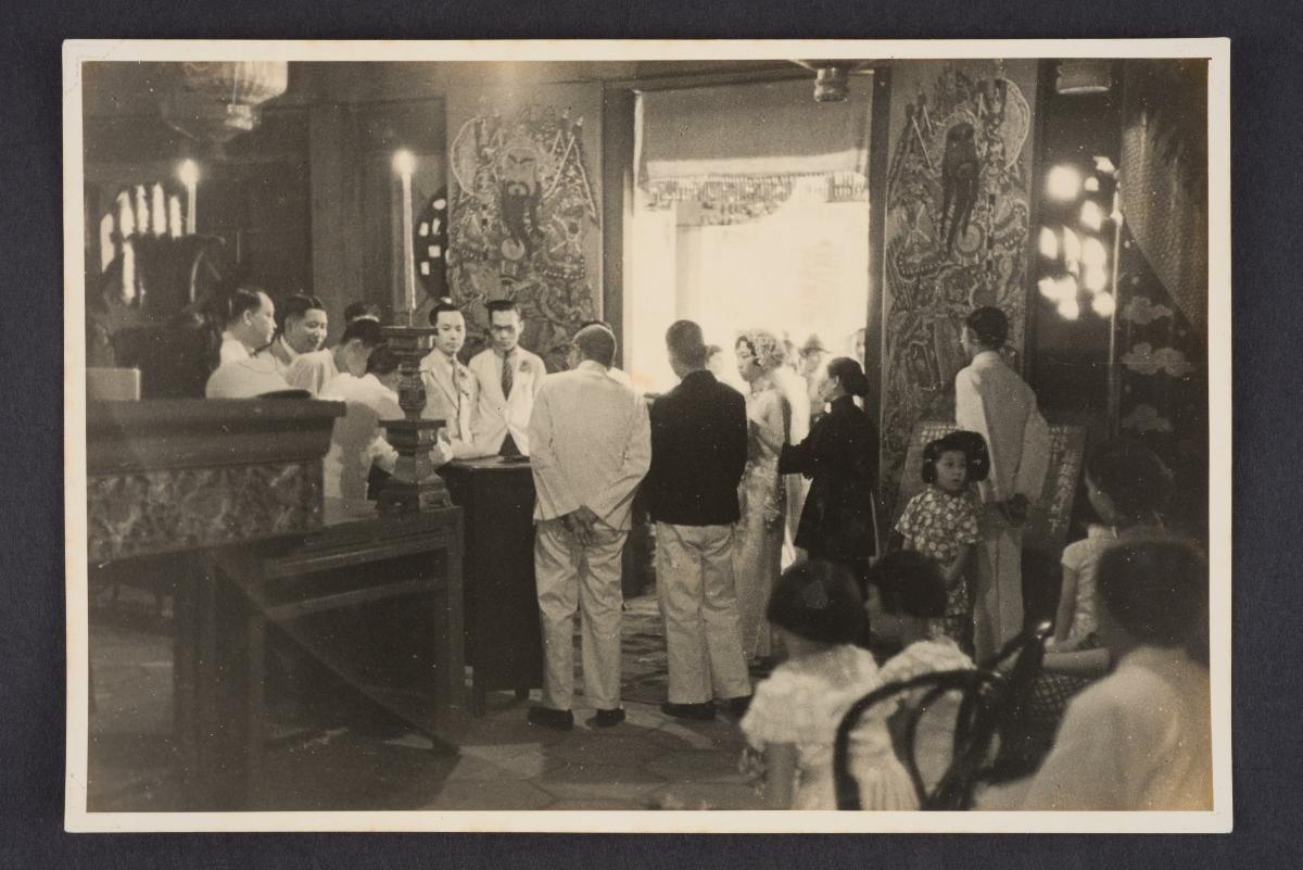 This photograph shows a nyonya in sarong kebaya, with her right arm on a table. "4/1922" is inscribed on the back of the photograph. This large group of photographs provides important visual documentation of the fashion, studio photography and lifestyle of Peranakans of the Straits Settlements and Indonesia in the late 19th to mid-20th centuries. The collection also allows study of different photographic techniques and covers a wide range of themes, including changing fashions (from baju panjang and baju kurong to kebaya and cheongsam), festive celebrations (weddings, funerals, ancestral rites, Chinese New Year), interiors, transportation and children.