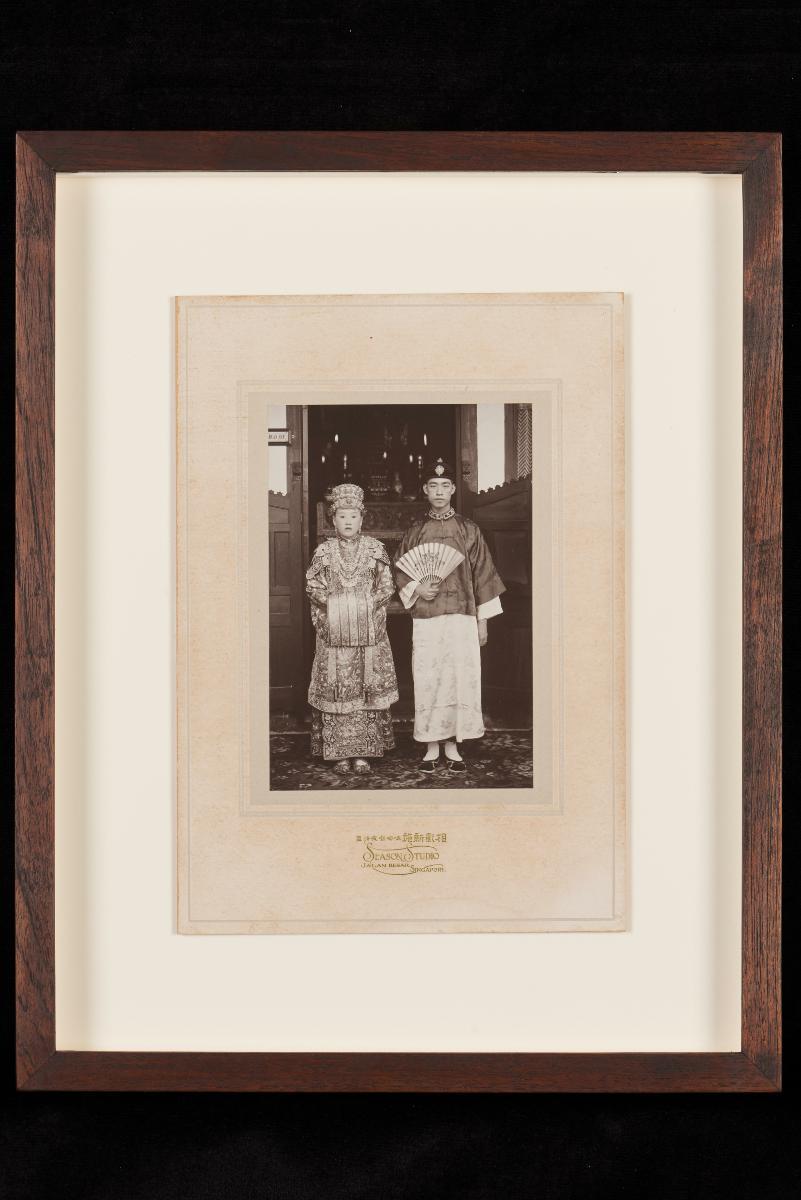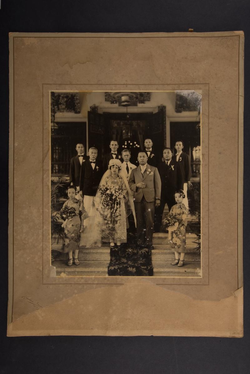 This photograph shows a bride in a western gown in front of an altar. The back of the photograph reads “The Bride”. This large group of photographs provides important visual documentation of the fashion, studio photography and lifestyle of Peranakans of the Straits Settlements and Indonesia in the late 19th to mid-20th centuries. The collection also allows study of different photographic techniques and covers a wide range of themes, including changing fashions (from baju panjang and baju kurong to kebaya and cheongsam), festive celebrations (weddings, funerals, ancestral rites, Chinese New Year), interiors, transportation and children.
