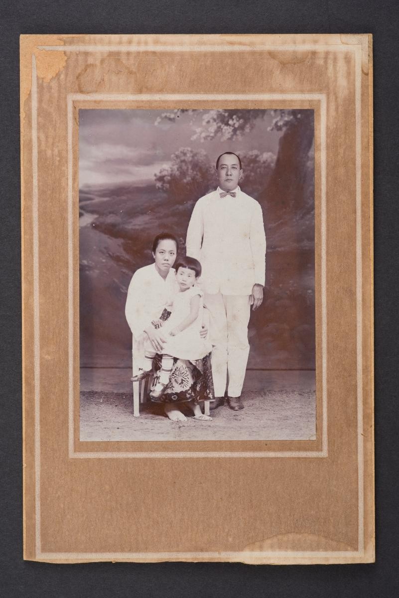 This studio portrait shows a Peranakan man in suit and woman in sarong kebaya with a girl in the middle. This large group of photographs provides important visual documentation of the fashion, studio photography and lifestyle of Peranakans of the Straits Settlements and Indonesia in the late 19th to mid-20th centuries. The collection also allows study of different photographic techniques and covers a wide range of themes, including changing fashions (from baju panjang and baju kurong to kebaya and cheongsam), festive celebrations (weddings, funerals, ancestral rites, Chinese New Year), interiors, transportation and children.
