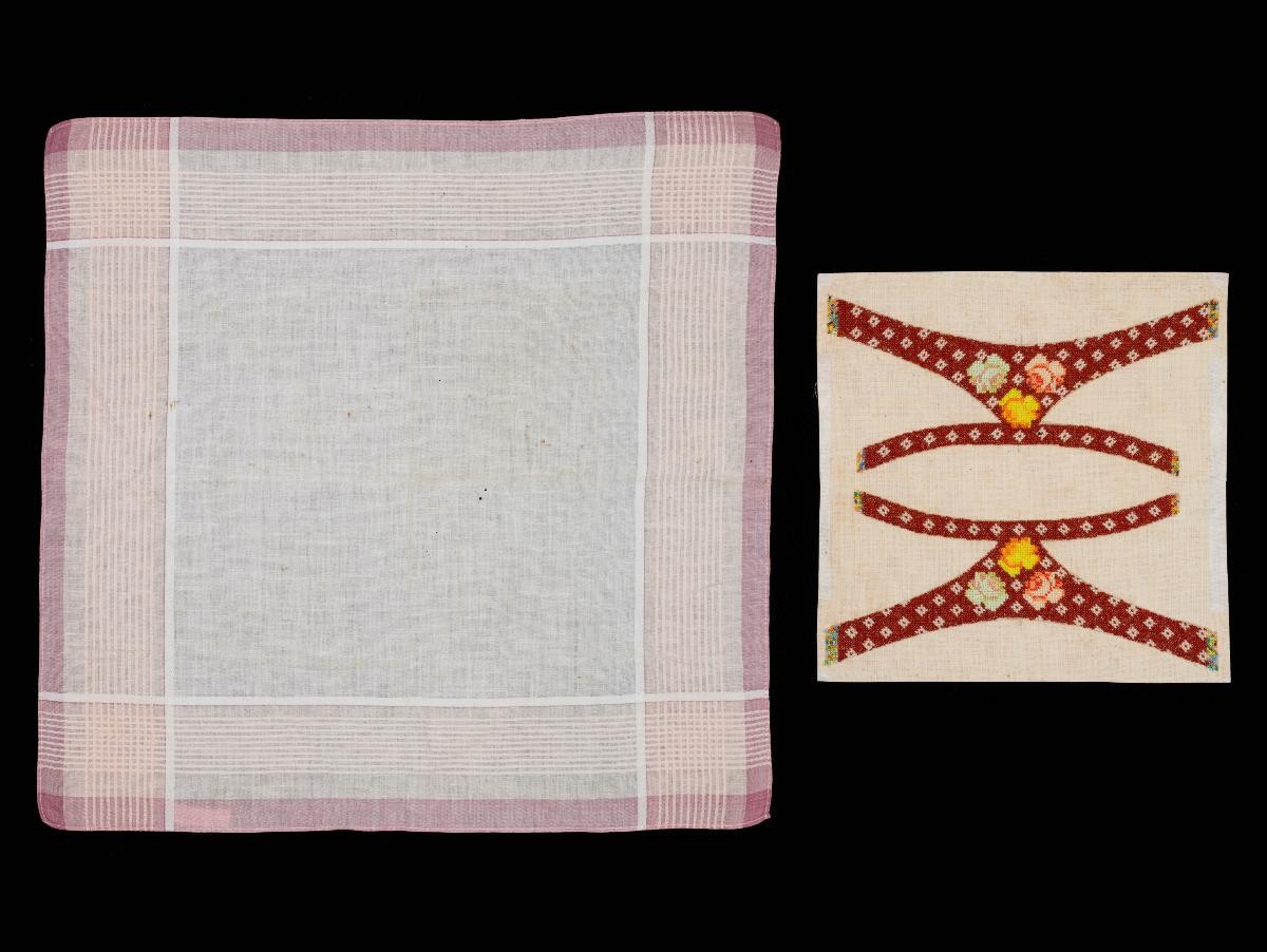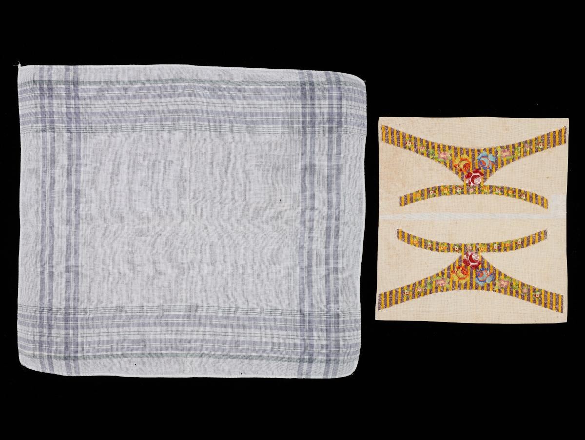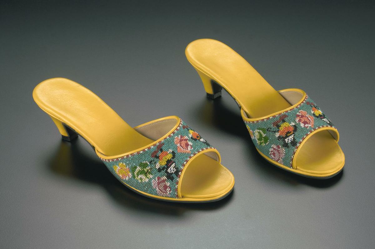 This pair of open toed beaded slippers with a thin slipper face decorated with pink flowers and leaves on a green background with an edge of red triangles, similar to those found at the edge of batik sarongs. A shop mark reading “SCHOENMAKER (MARDJOEKI) TJIANDJOER” indicates that the pair is made in Indonesia. Beaded slippers, known as kasut manek in Baba Malay date back to the early 20th century and were worn by Peranakan men and women. The slipper faces were beaded on a frame or pidangan and then a Chinese shoe maker would attach it to a leather slipper base.
