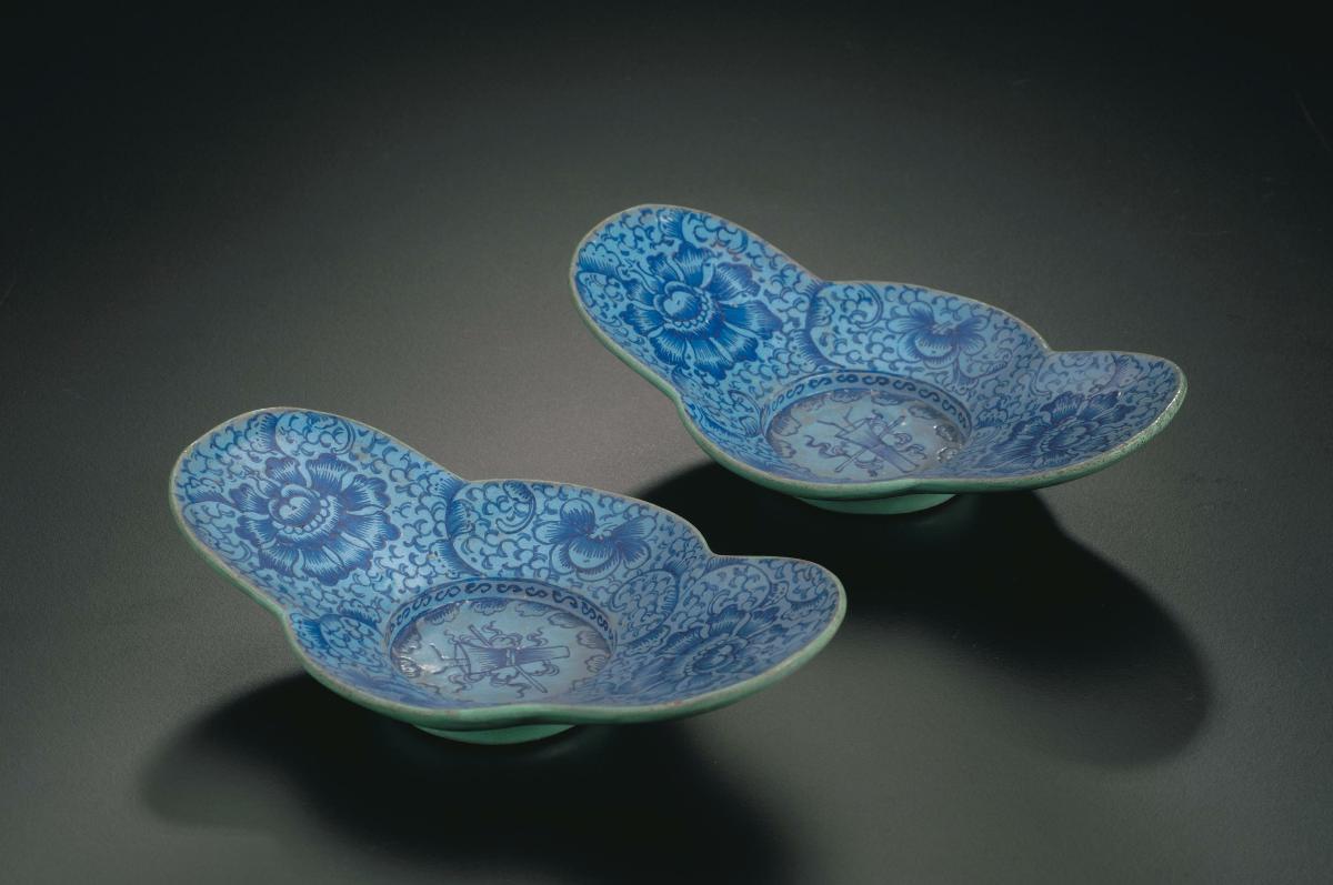 These stands were probably used on a dining table to elevate serving dishes. The shape was uncommon in Asia at the time, so these were likely intended for the European market. They are decorated in underglaze cobalt blue, with piercings, and a simple blue border.