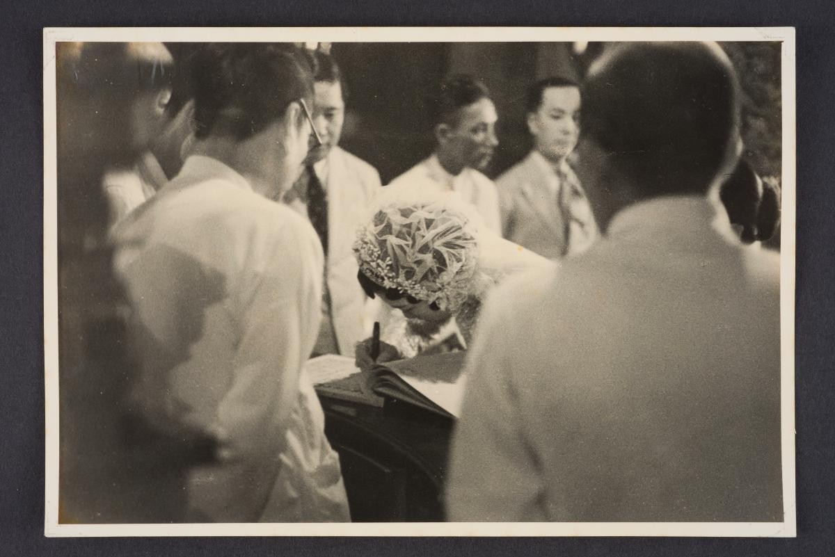 This photograph shows a woman with her in an open necked top. This photograph is signed and on back reads “8282/P.C-4/送8寸-1/(?)十一月十五日(?)”. This large group of photographs provides important visual documentation of the fashion, studio photography and lifestyle of Peranakans of the Straits Settlements and Indonesia in the late 19th to mid-20th centuries. The collection also allows study of different photographic techniques and covers a wide range of themes, including changing fashions (from baju panjang and baju kurong to kebaya and cheongsam), festive celebrations (weddings, funerals, ancestral rites, Chinese New Year), interiors, transportation and children.