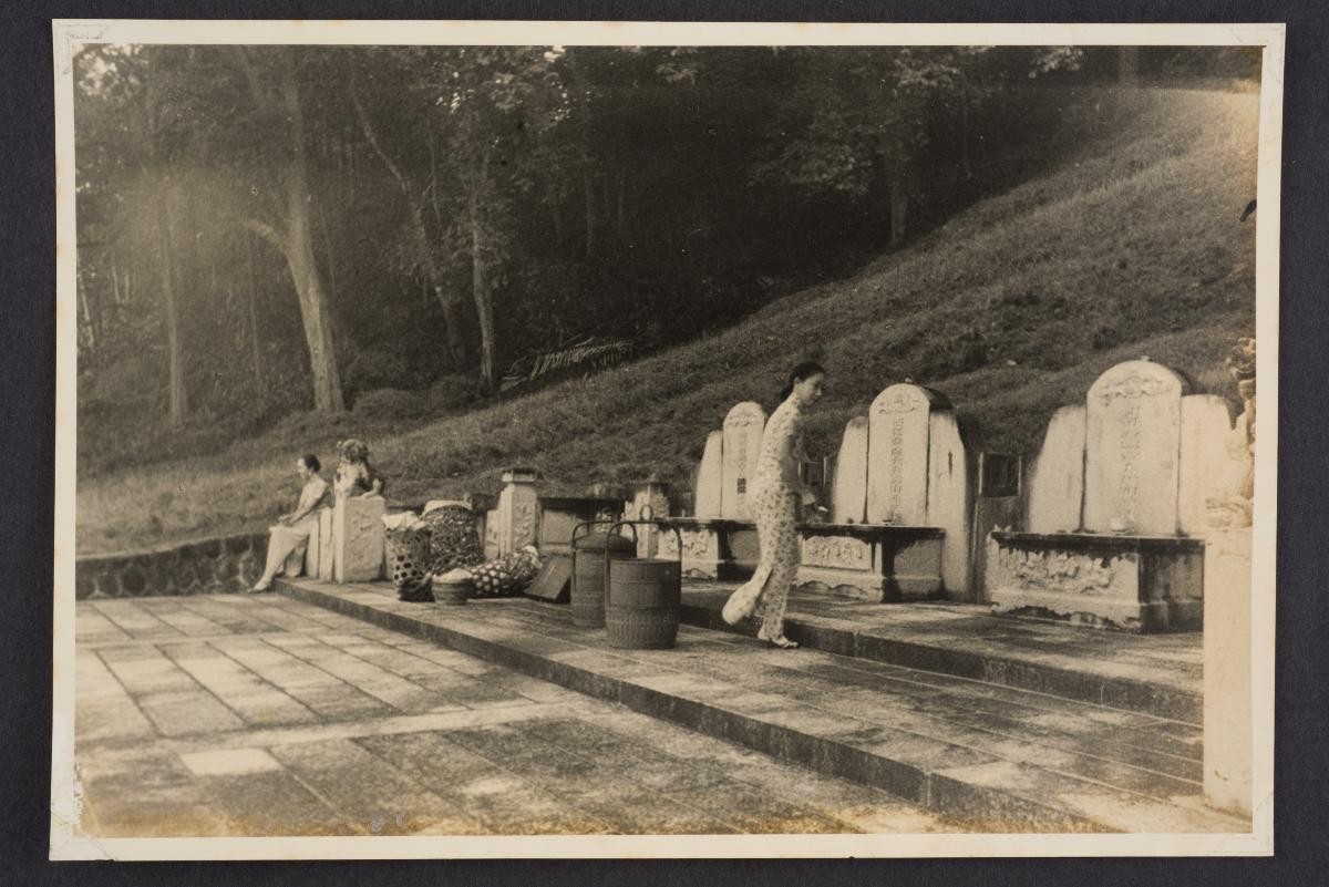 This photograph shows a bride and groom in western wedding attire. Two flower girls stand beside them. The back of the photograph reads “The wedding (?) / 1937/ Mr & Mrs George Alexander & Cha(?) & Mousset (Acting President Council(?) Penang 1937-38). A note was cut and pasted on the back of the photograph which reads “Name: Michael Cheah W. Chim/ Address: 4, Nirvana Terrace, 10400, Penang/ Tel No: 372203 (RES.) / 20405 (OFF)/ 342”. It belongs to the category (b) People, Places & Events. This large group of photographs provides important visual documentation of the fashion, studio photography and lifestyle of Peranakans of the Straits Settlements and Indonesia in the late 19th to mid-20th centuries. The collection also allows study of different photographic techniques and covers a wide range of themes, including changing fashions (from baju panjang and baju kurong to kebaya and cheongsam), festive celebrations (weddings, funerals, ancestral rites, Chinese New Year), interiors, transportation and children.