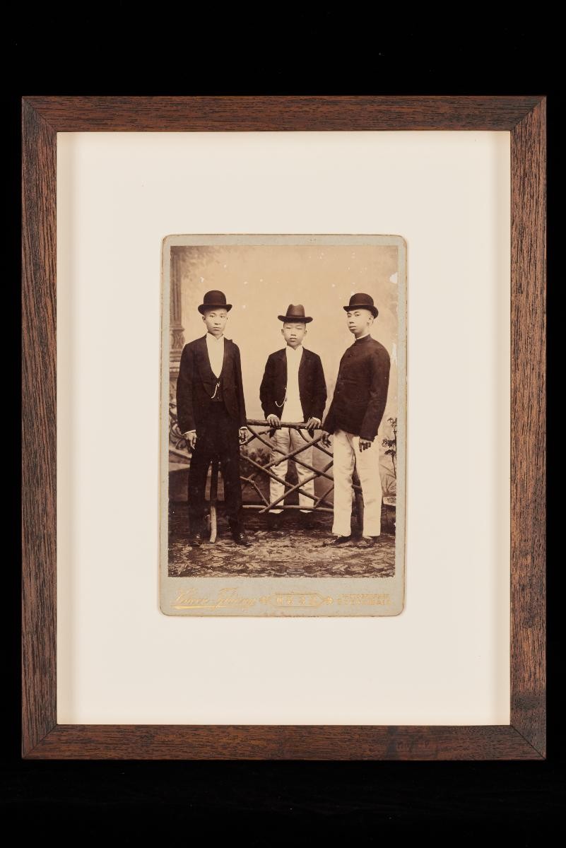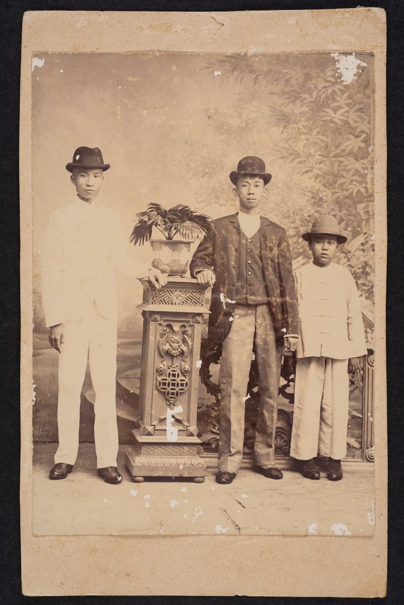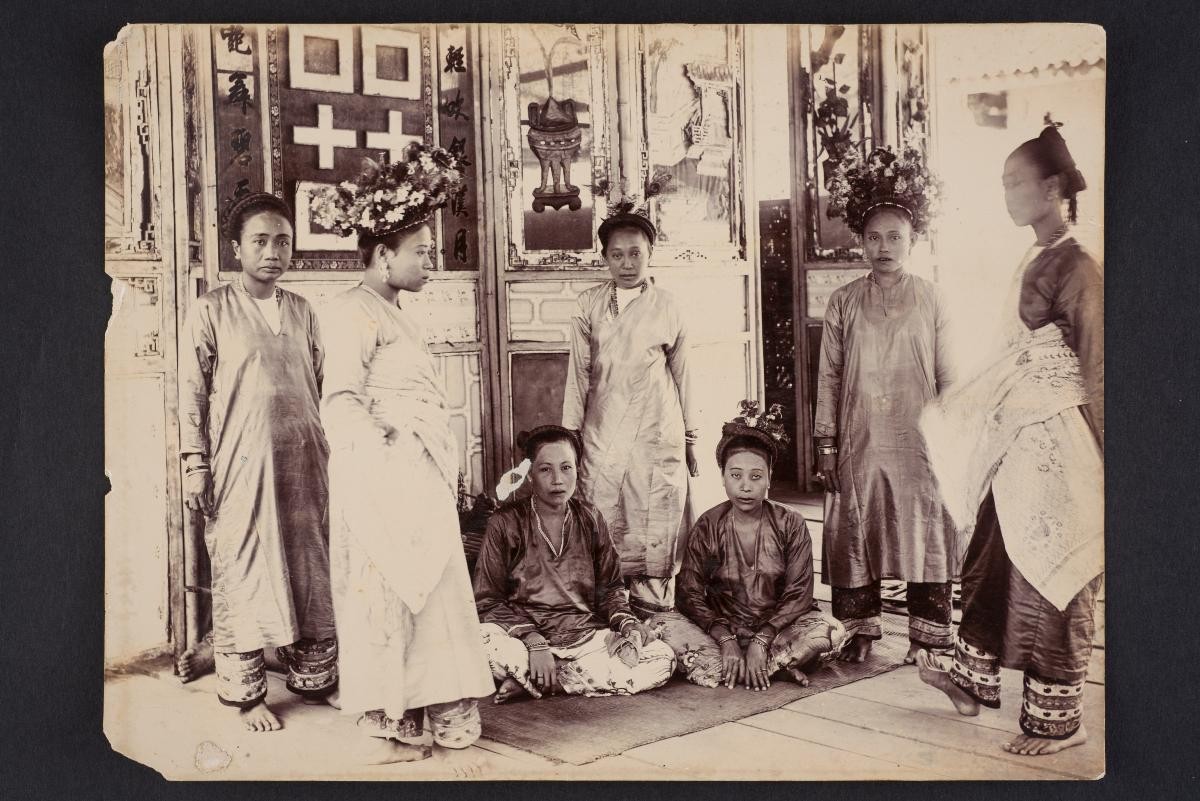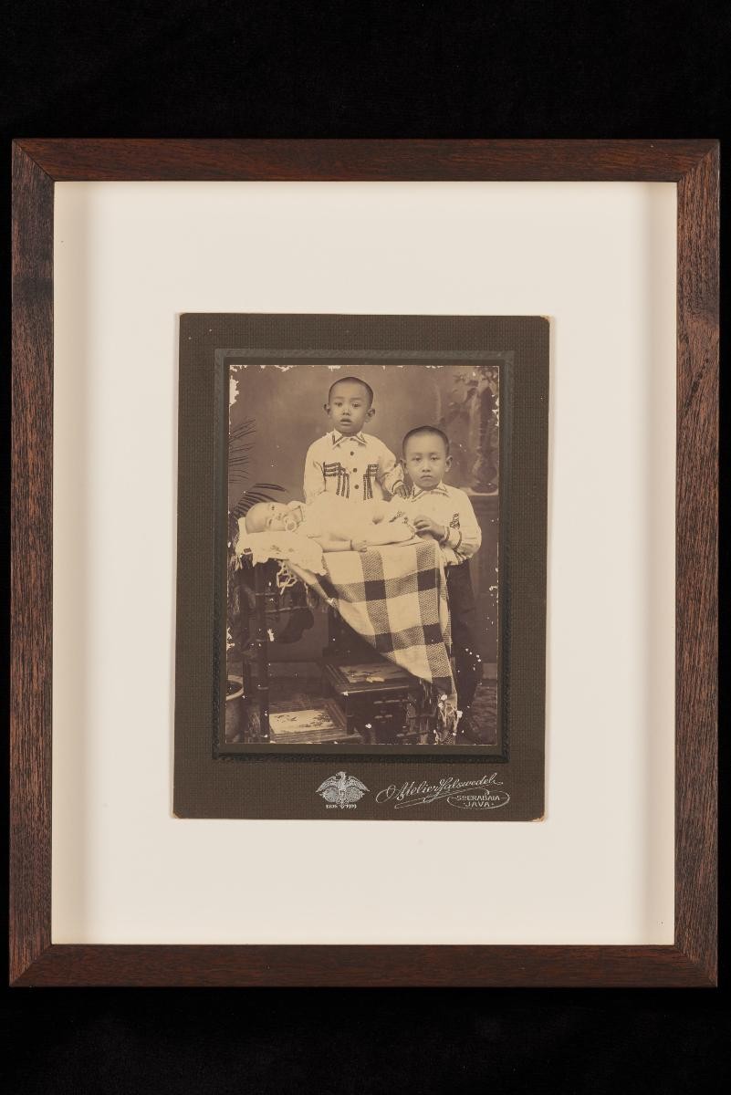 This photograph shows a seated man with a cane and hat. This large group of photographs provides important visual documentation of the fashion, studio photography and lifestyle of Peranakans of the Straits Settlements and Indonesia in the late 19th to mid-20th centuries. The collection also allows study of different photographic techniques and covers a wide range of themes, including changing fashions (from baju panjang and baju kurong to kebaya and cheongsam), festive celebrations (weddings, funerals, ancestral rites, Chinese New Year), interiors, transportation and children.