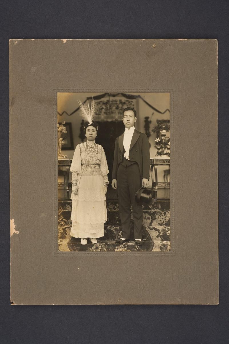 This photograph shows two men, one seated and one standing. This large group of photographs provides important visual documentation of the fashion, studio photography and lifestyle of Peranakans of the Straits Settlements and Indonesia in the late 19th to mid-20th centuries. The collection also allows study of different photographic techniques and covers a wide range of themes, including changing fashions (from baju panjang and baju kurong to kebaya and cheongsam), festive celebrations (weddings, funerals, ancestral rites, Chinese New Year), interiors, transportation and children.