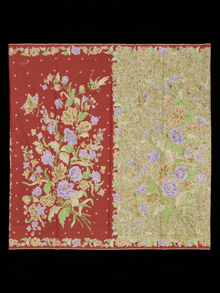 This red printed batik kain panjang was worn by Dr Margaret Chan for her 1993 charity performance of Emily of Emerald Hill at Raffles Hotel. It was paired with a green kebaya during the second act of the play. Written by Stella Kon in 1982, Emily of Emerald Hill tells the story of a Peranakan woman from young bride to strong-willed matriarch in the Peranakan enclave of Emerald Hill, in Singapore.