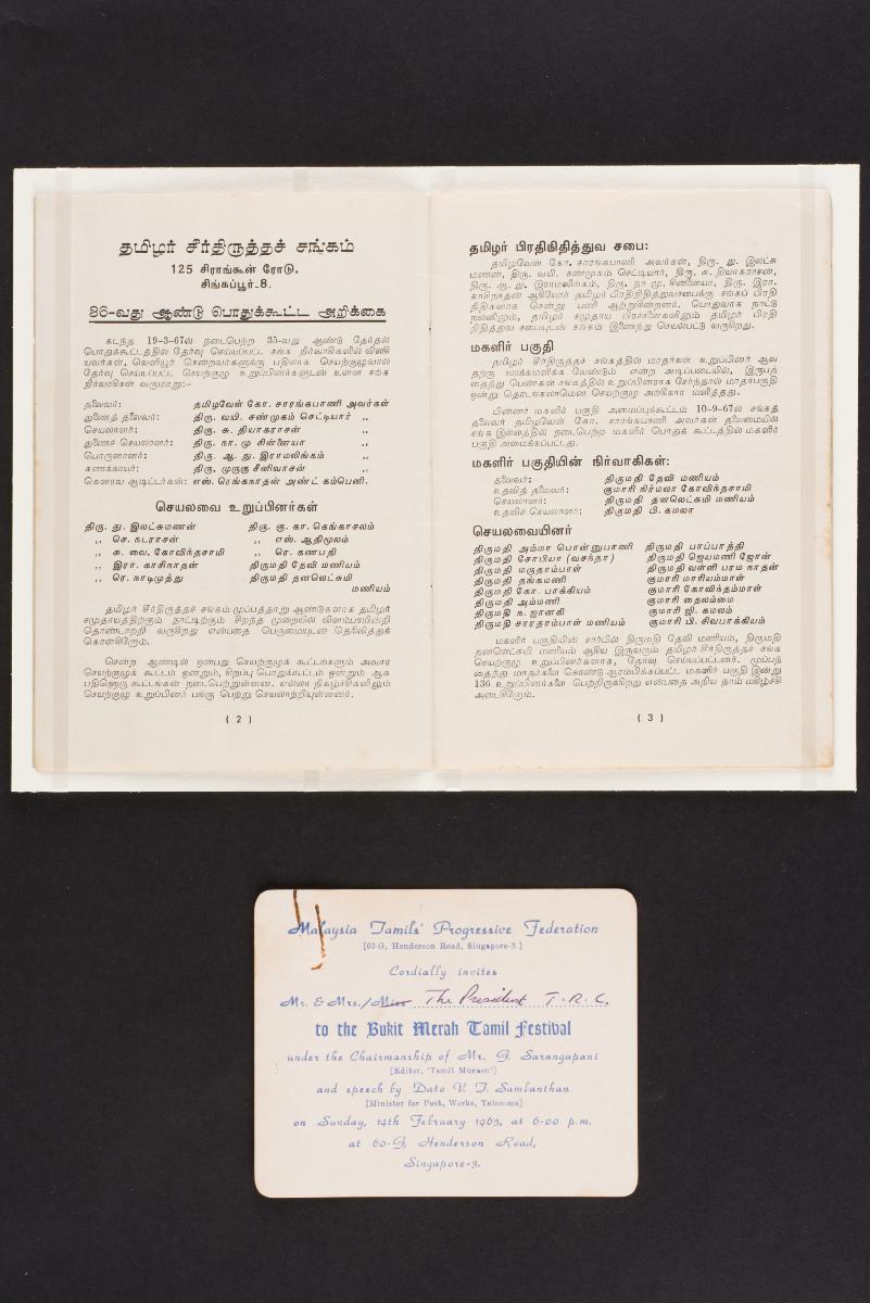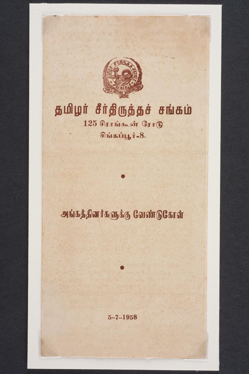 G Sarangapany, titled Thamizhavel, arrived in Singapore in 1924. A believer of Periyar’s principles, he played a key role in extending the Self-Respect Movement to Singapore and Malaya and became the agent for distribution of the movement’s magazine Kudi Arasu in British Malaya. He later helped arrange Periyar’s visits to Singapore and Malaya. He was an active writer and publisher in his own right. In 1929 he set up the Tamil magazine Munnetram, and Tamil Murasu in 1935. Through his writings he promoted the principles of the Tamil reform movement. He encouraged Tamils to make Singapore their home, helped them gain citizenship and championed for the cause of the Tamil language to be recognised as one of the national languages in Singapore. This is a collection of archival photographs, documents donated by the family of Sarangapany’s close associate, Murugu Srinivasan.
