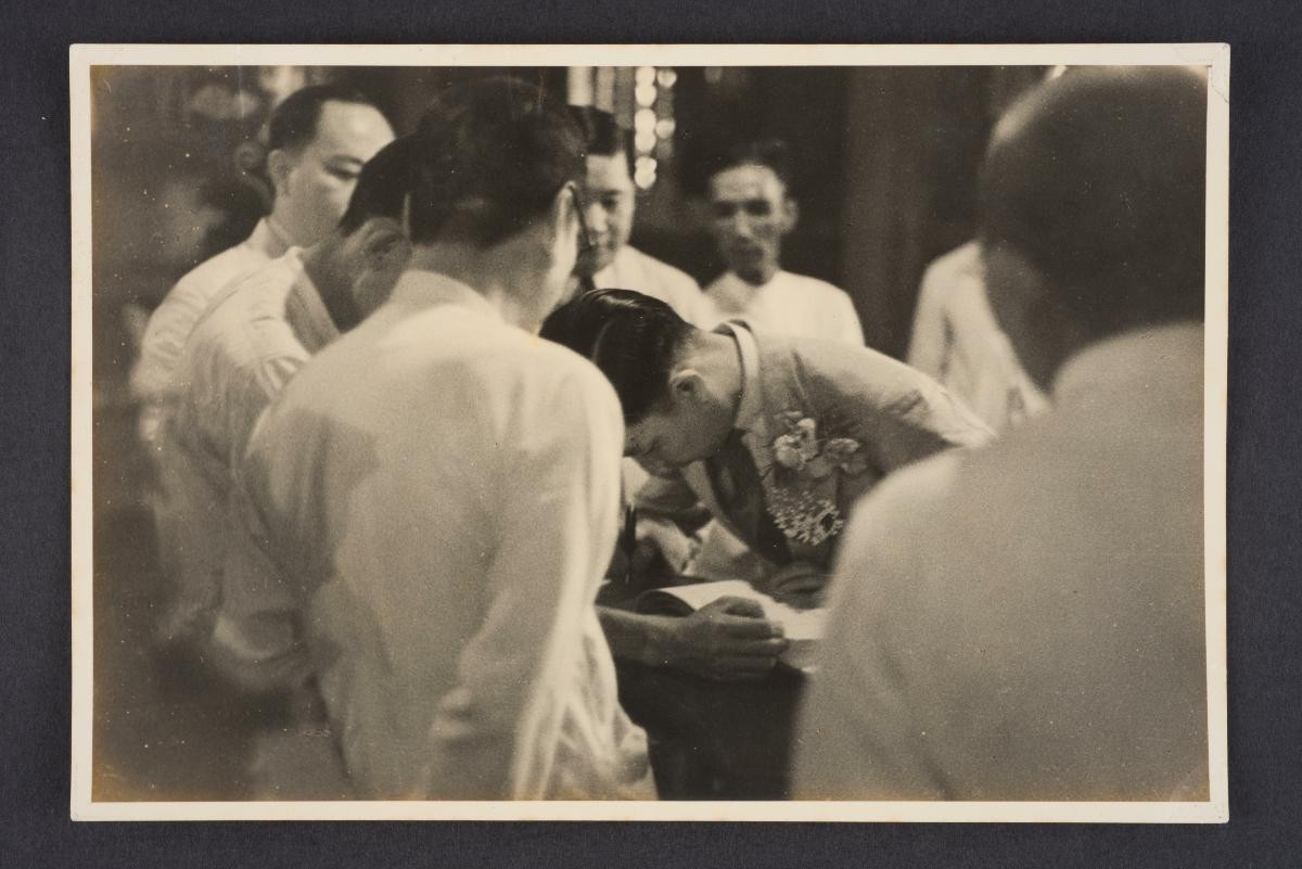This photograph shows a temple or ancestral hall. According to inscription, the photograph was taken on the occasion of Mr Khoo Teng Cheang’s marriage. This large group of photographs provides important visual documentation of the fashion, studio photography and lifestyle of Peranakans of the Straits Settlements and Indonesia in the late 19th to mid-20th centuries. The collection also allows study of different photographic techniques and covers a wide range of themes, including changing fashions (from baju panjang and baju kurong to kebaya and cheongsam), festive celebrations (weddings, funerals, ancestral rites, Chinese New Year), interiors, transportation and children.