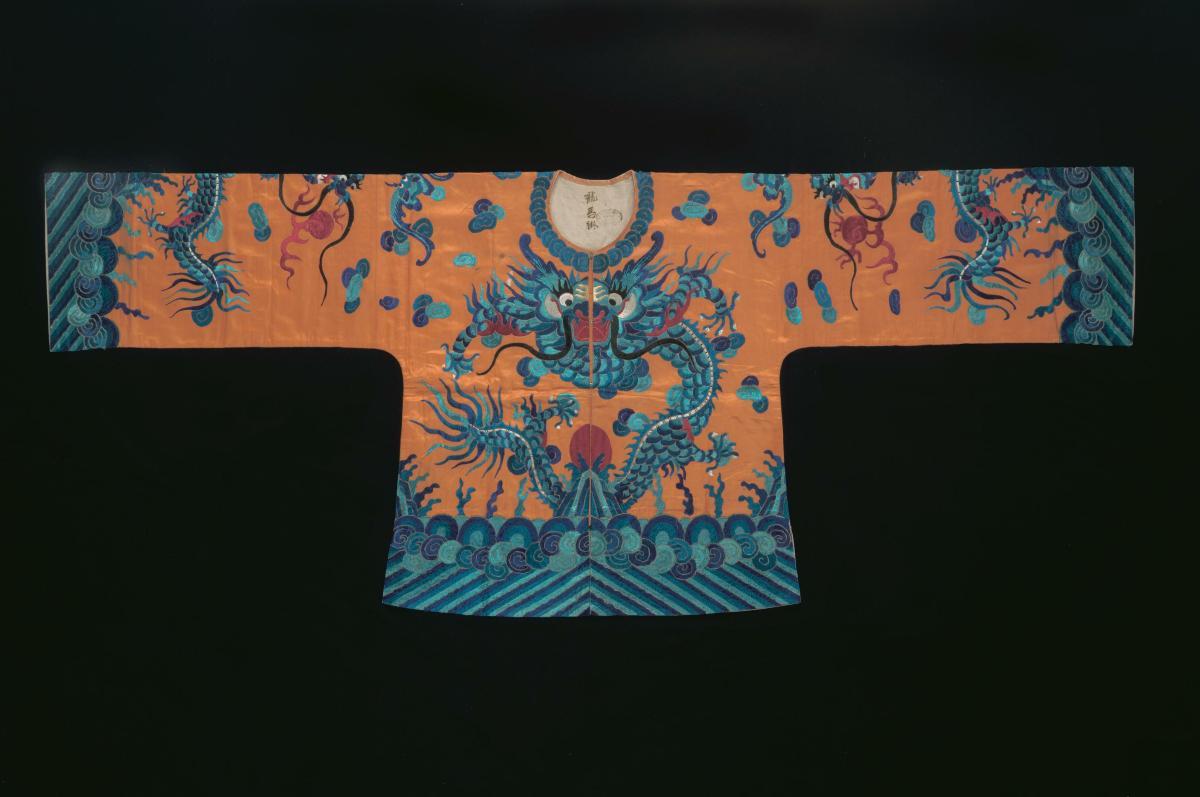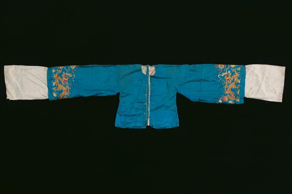 In a blue and orange striped fabric, this top has a high collar, pleated cuffs and large pockets on its front. A lace border with teardrop patterns is attached to its hem. This top may have been inspired by baju dalam, which was of a similar construction and was popular in the 20th century as an undergarment worn beneath organdie baju panjangs. This is part of a donation which contains a mixture of garments worn by Peranakan men and women.