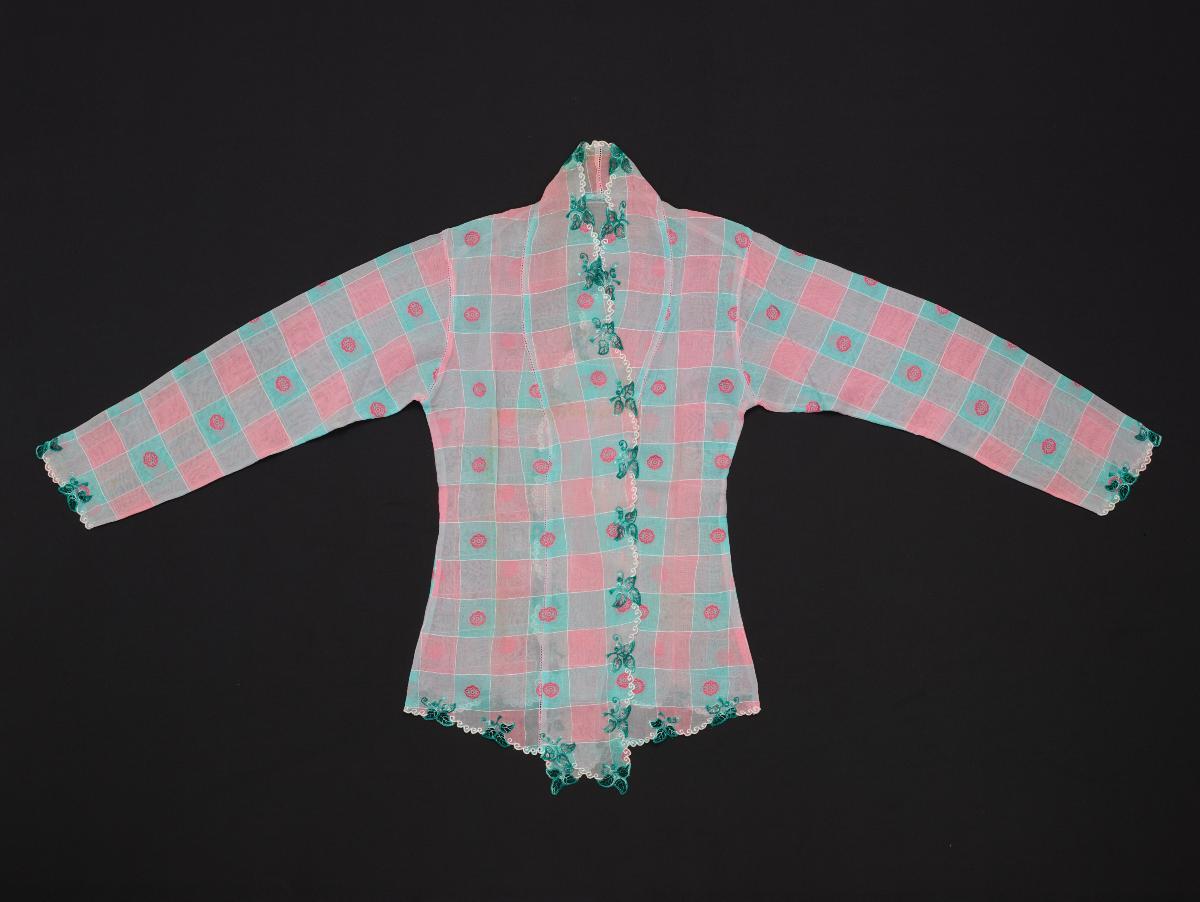 This kebaya is made from a light fabric printed with a recurring motif of foliage and small flowers. It is part of a donation which contains a mixture of garments worn by Peranakan men and women.