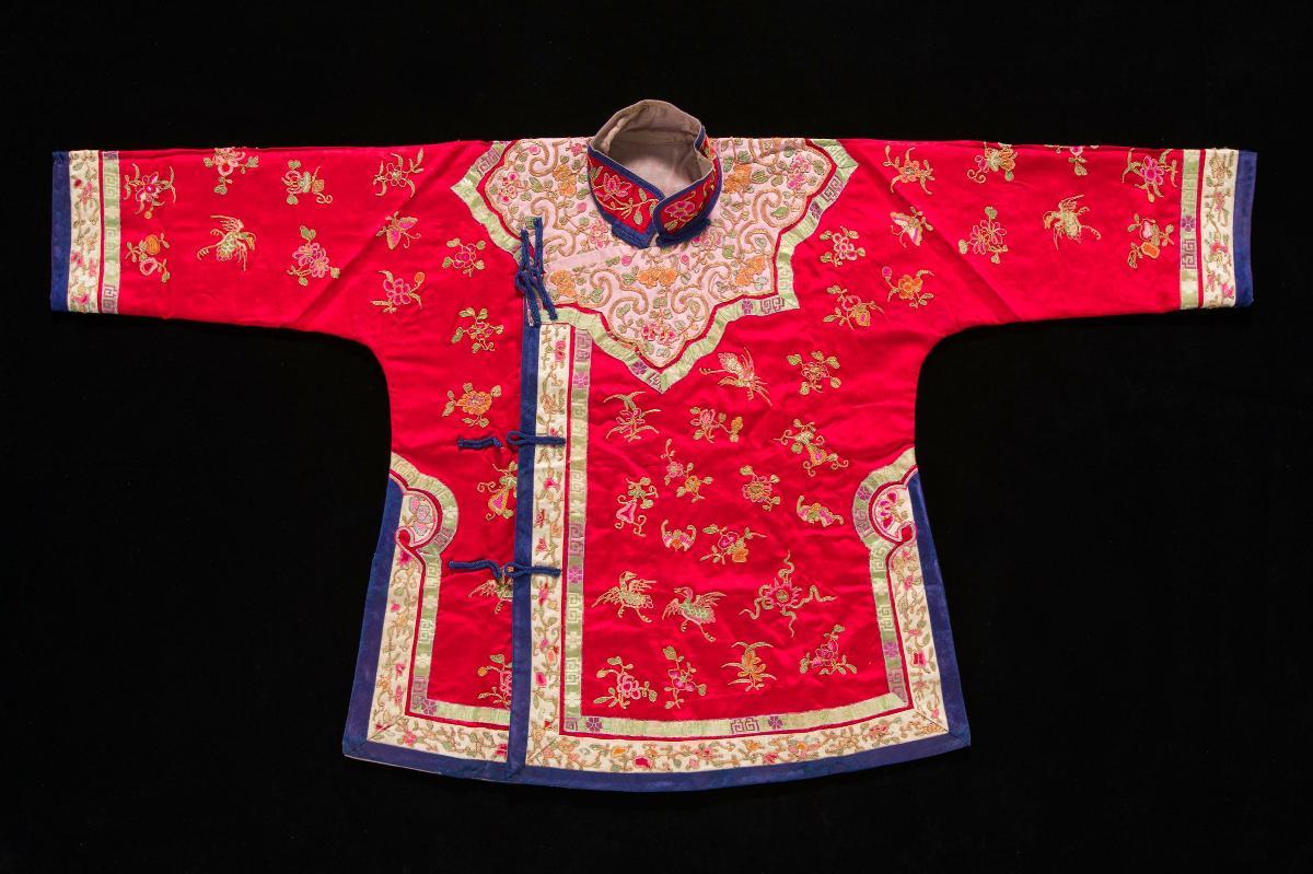 This child’s silk embroidered jacket would have likely been worn by the page boy during the wedding procession. It would have been paired with matching silk trousers and his head would have been adorned with a hat. A beaded collar would have also been worn with special embroidered shoes to complete the outfit.This is an important and diverse collection of Peranakan Chinese beadwork and embroidery from Indonesia. It contains unusual forms of beadwork and embroidery and are reflective of the fondness that Peranakan Chinese throughout Southeast Asia have for bright colours and ornate decorations.