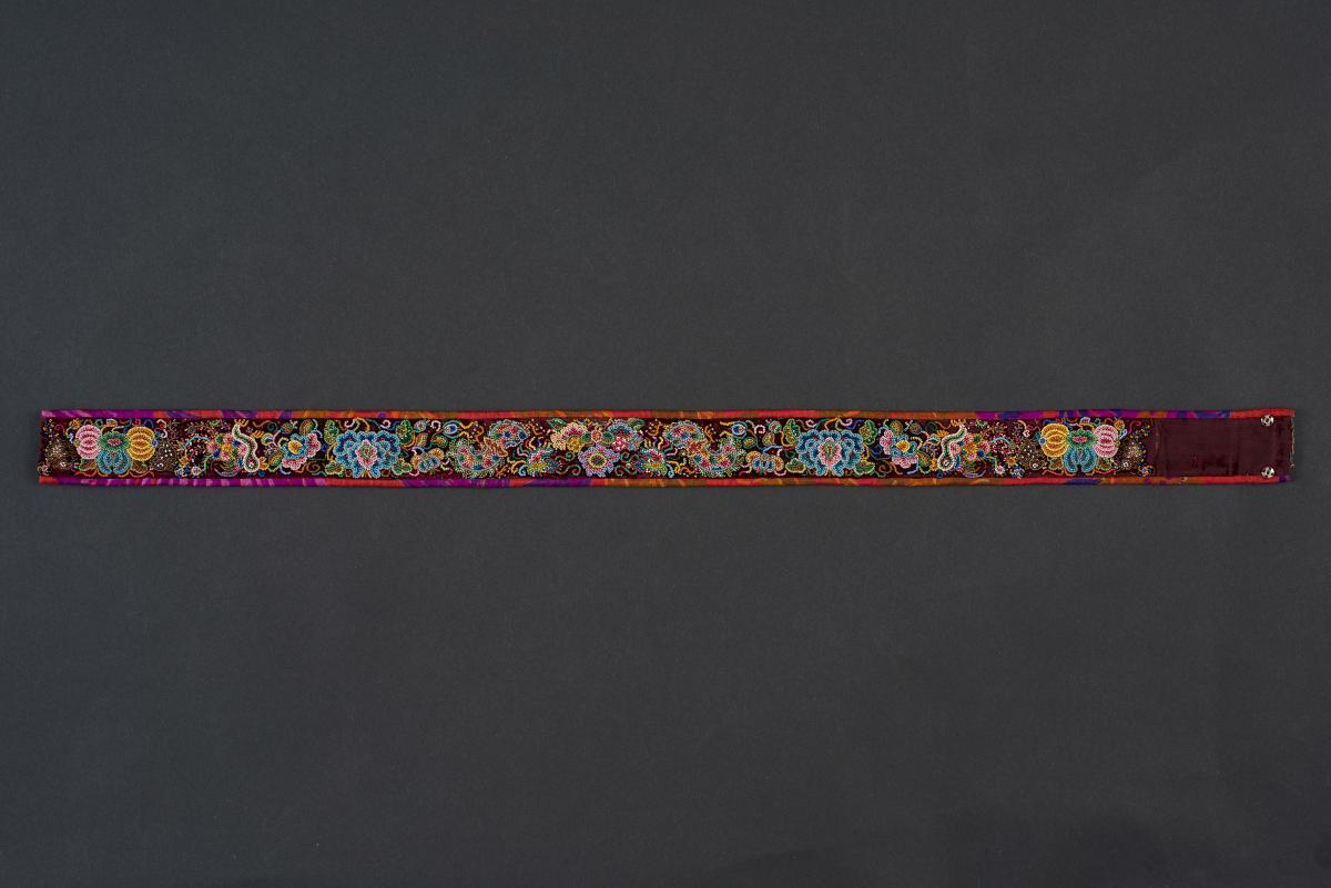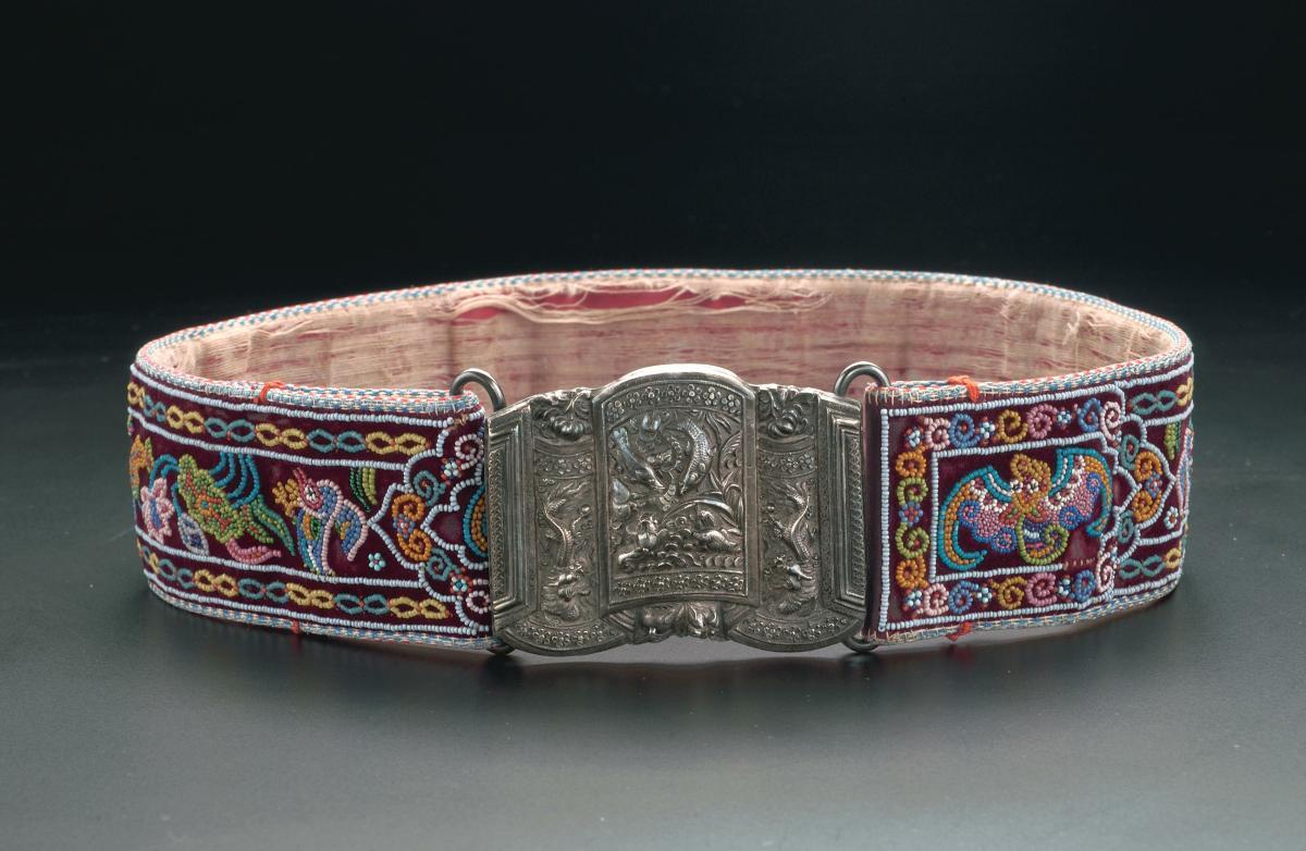 These belts are made out of a piece of leather embroidered with velvet and cut beads or manek potong. Two have gilded silver belt buckles and are decorated with various auspicious motifs. Belts like these would have been worn by Peranakan women to hold their sarongs (tubular skirts) in place. This is an important and diverse collection of Peranakan Chinese beadwork and embroidery from Indonesia. It contains unusual forms of beadwork and embroidery and are reflective of the fondness that Peranakan Chinese throughout Southeast Asia have for bright colours and ornate decorations.