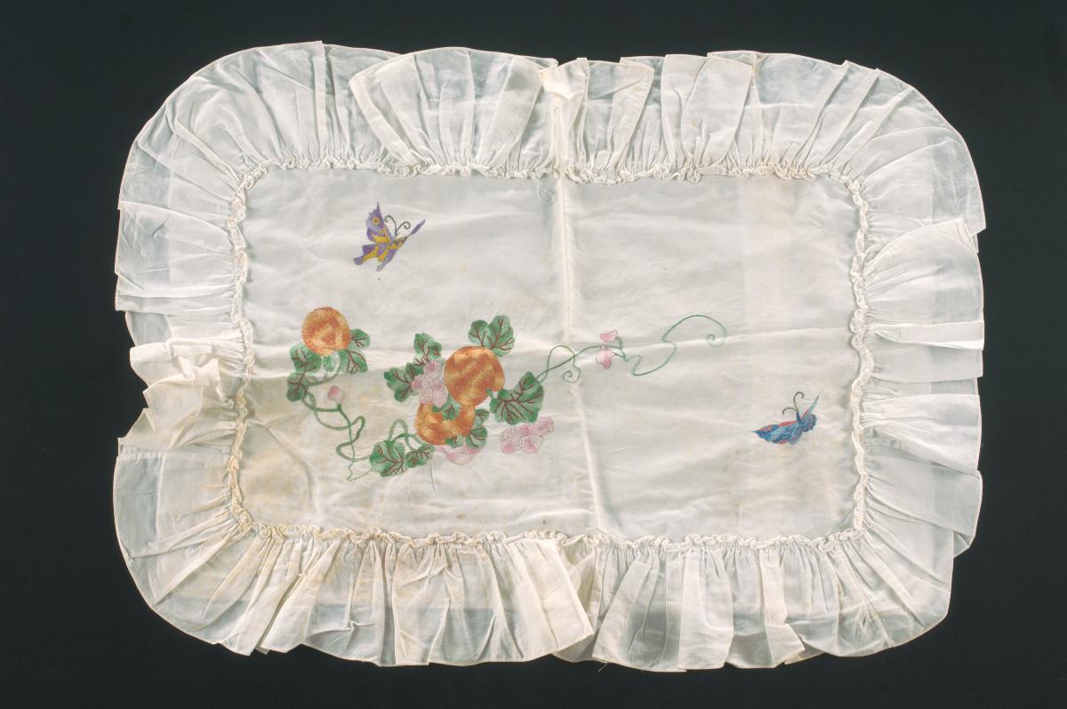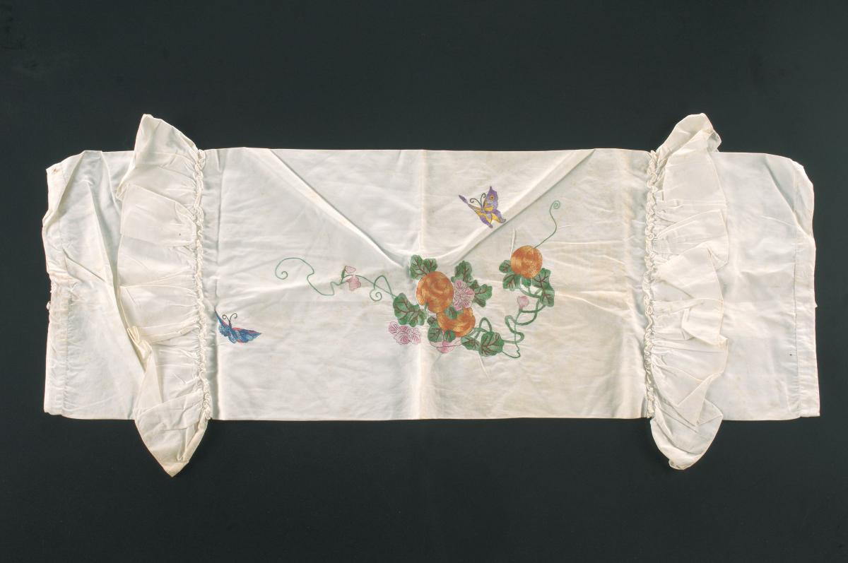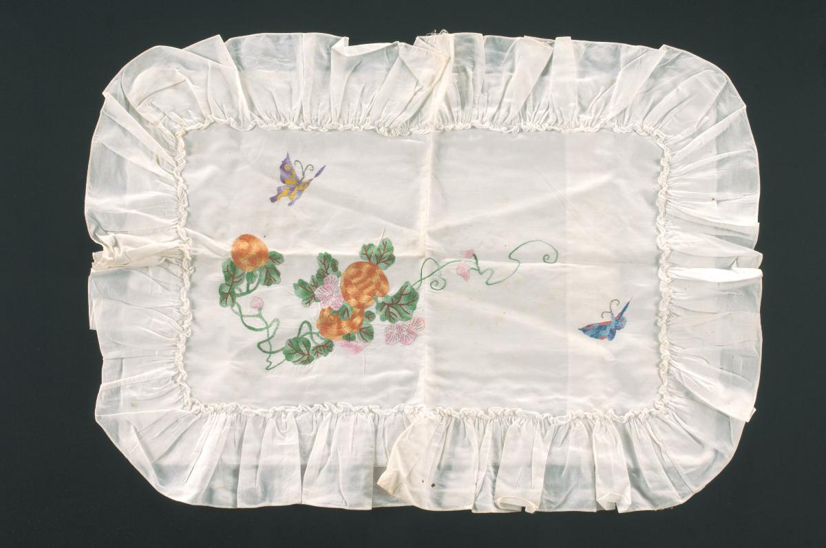 This pillow case is covered with white delicate white lace. A line of button clasps can be found along its opening. The words ‘Mevr Ooi Foon Ling’ is embroidered in white thread on the reverse. The making of bobbin lace was an established tradition in port cities like Malacca and Palembang by the early 20th century. It is part of a donation which contains a mixture of garments worn by Peranakan men and women.