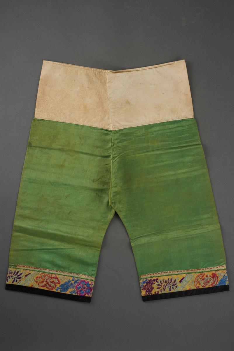 This pair of trousers was probably made for a child. The fabric is printed with bouquets of peonies. Its hem is decorated with an embroidered floral border. It is part of a donation which contains a mixture of garments worn by Peranakan men and women.