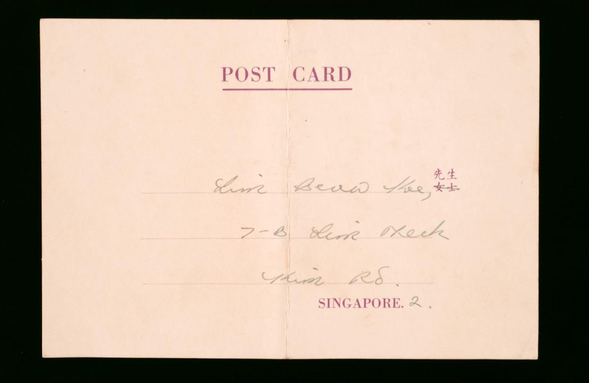 This postcard shows Herbert Lim Eng Kwan (1927-2002) in his scout uniform. Son of Lim Chong Pang and grandson of the Peranakan pineapple and rubber planter and prominent philanthropist Lim Nee Soon, Herbert was evacuated with his family to Bangalore Cantonment before Singapore fell to the Japanese in 1942. He was a was a King’s Scout and leader of Clarence High School’s 4th Bangalore Troop. On the reverse is written ‘Patience is a golden virtue’. The postcard is part of a donation which contains a mixture of garments worn by Peranakan men and women.