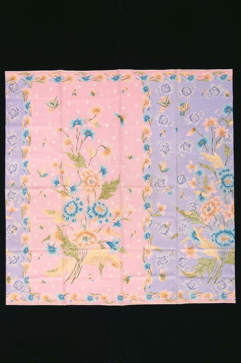 This brown and pale pink sarong is decorated with large sprays of flowers in grouped together in a bouquet, with birds and butterflies darting around them. This motif reoccurs throughout the textile and is known as the buketan motif. It was a design popularized by the maker of this sarong, the Dutch-Eurasian batik maker, Eliza Van Zuylen. Flowers also border the top and bottom edge of the sarong. Batik sarongs were worn by Peranakan Chinese in the Strait Settlements and Indonesia as a skirt to accompany a top known as a kebaya.