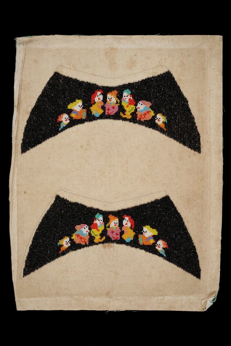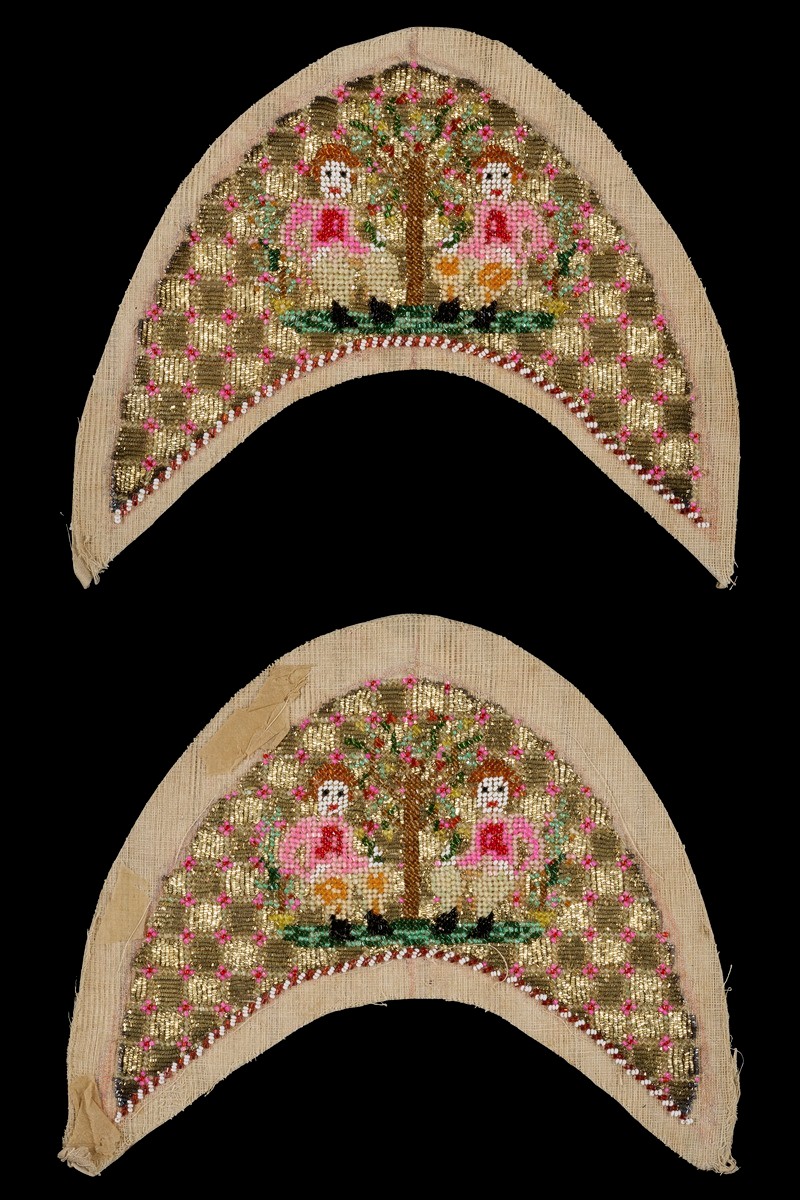 This pair of uncut slipper faces is designed with silver wrapped thread embroidered onto brown velvet in the shape of floral sprays. The slipper faces would be subsequently cut out and sent to Chinese shoemakers to be sewn into a pair of shoesThis is an important and diverse collection of Peranakan Chinese beadwork and embroidery from Indonesia. It contains unusual forms of beadwork and embroidery and are reflective of the fondness that Peranakan Chinese throughout Southeast Asia have for bright colours and ornate decorations.