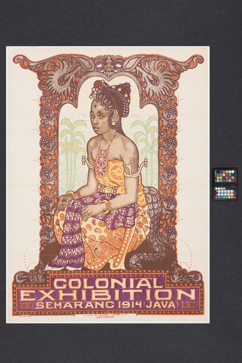 The central figure in this poster is based on a portrait photograph by Javanese photographer Kassian Cephas. While the figure and her accoutrements are obviously modelled on Cephas’s original, Hahn’s composition is also informed by his background in the decorative arts. The figure is framed by a richly carved wooden structure which has been identified as a Javanese gong standard, and the picture space between this frame and the figure is filled with a repeating pattern of palm trees, more graphic than representative, which serve more as a token of the tropics than as any realistic reference. Whilst Albert Hahn Sr. draws heavily on the photograph by Kassian Cephas, it is likely that Hahn knew the work as an illustration in a general text describing the colonies rather than in the context of Cephas’s own remarkable career.