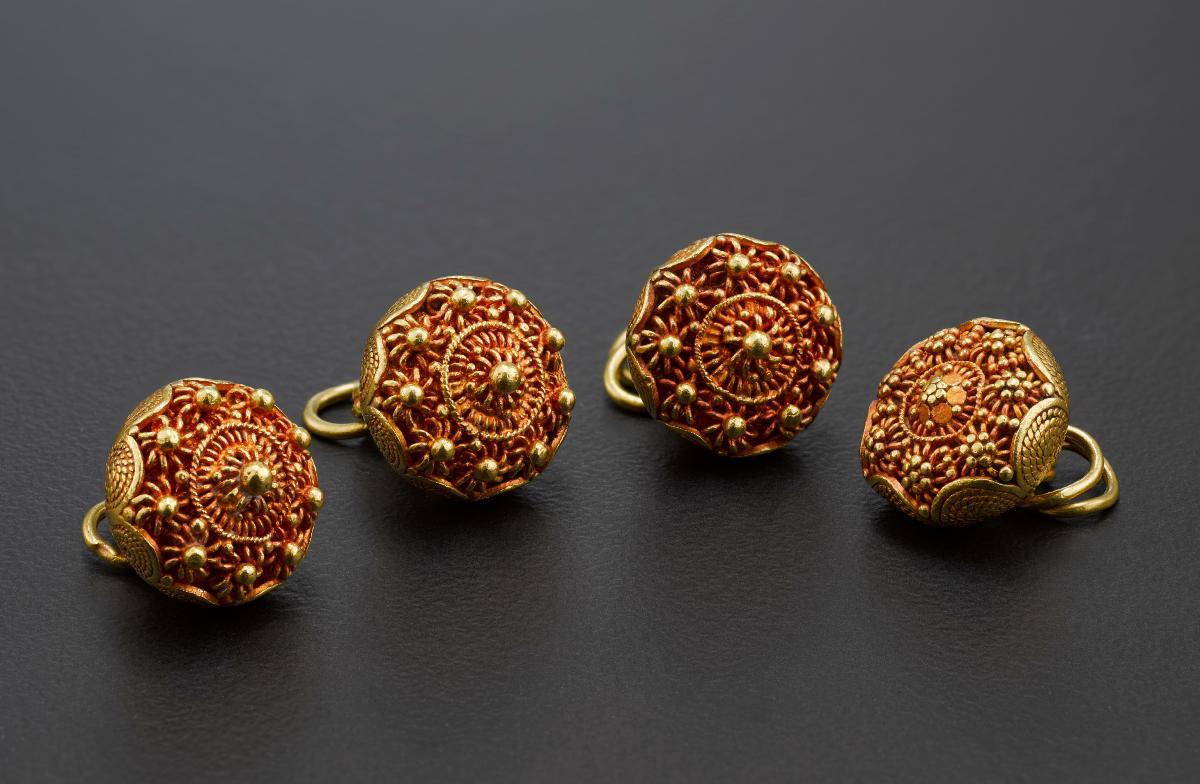 This baju panjang has a mandarin collar and gold frog buttons. The fabric is thin and embroidered with flowers. In late 19th century Java, there was a large selection of materials to choose from for the making of baju panjang, including silk, European cotton and velvet. It is part of a donation which contains a mixture of garments worn by Peranakan men and women.