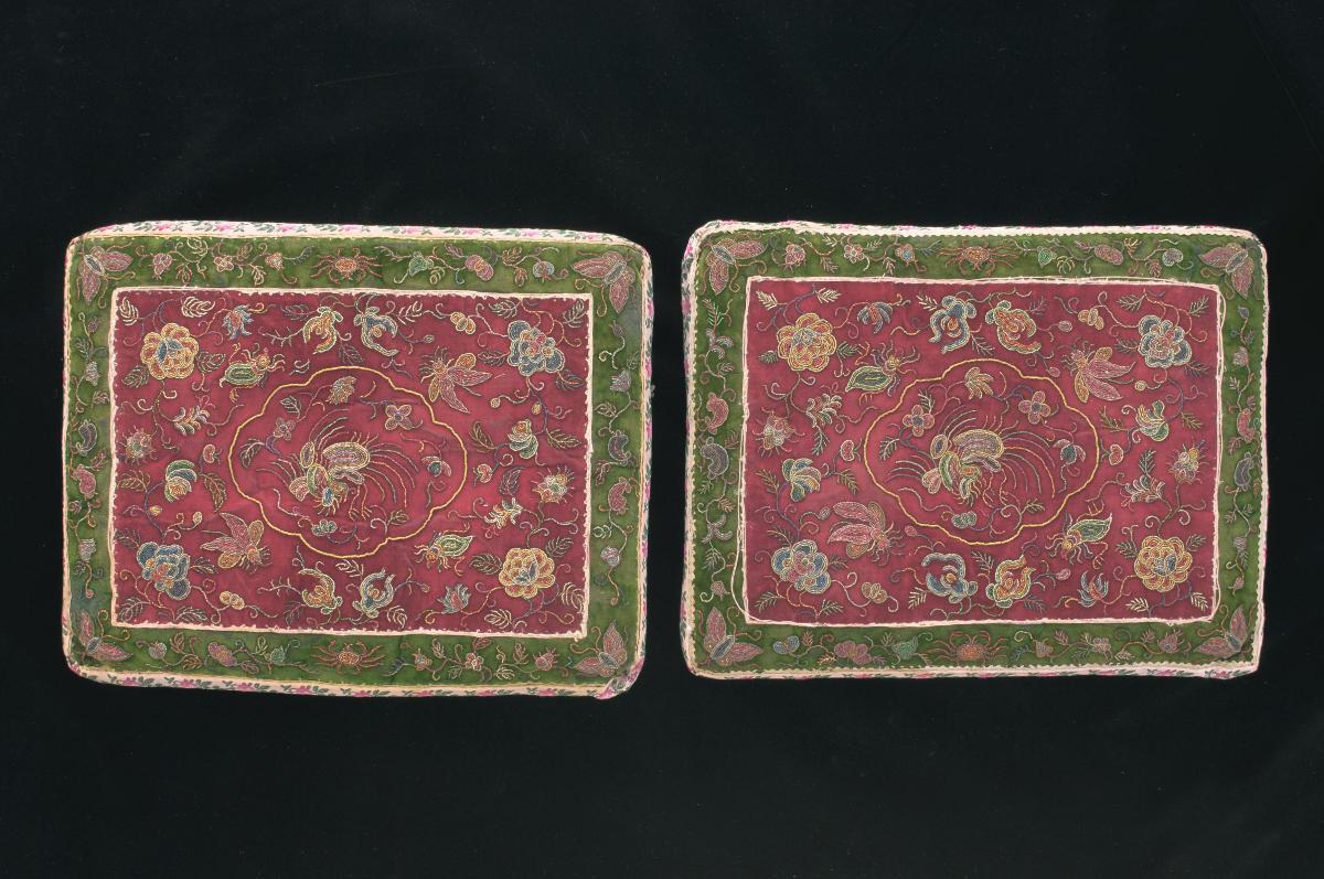This dompet has a unique semi-circular shape quite unlike other envelope purses. Chain and bullion stiches are used to create the contours of a butterfly and two stalks of flowers. Unlike Chinese purses which were either square or circular in shape, the purses made for or by the Peranakan community show more variation.