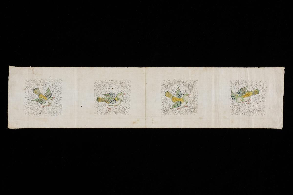 Fabric templates were used to guide the embroiderer. Along the central border is a repeating motif of a pair of birds flanking a singular lily stalk, set against a foliate background. A row of flowers on both sides complete the pattern.The small holes of double-thread Penelope canvas and other kinds of counted-thread canvases, made it possible to create out of beads designs which were originally used for silk embroidery. The fabric was cut diagonally so as to align beads in a vertical position.