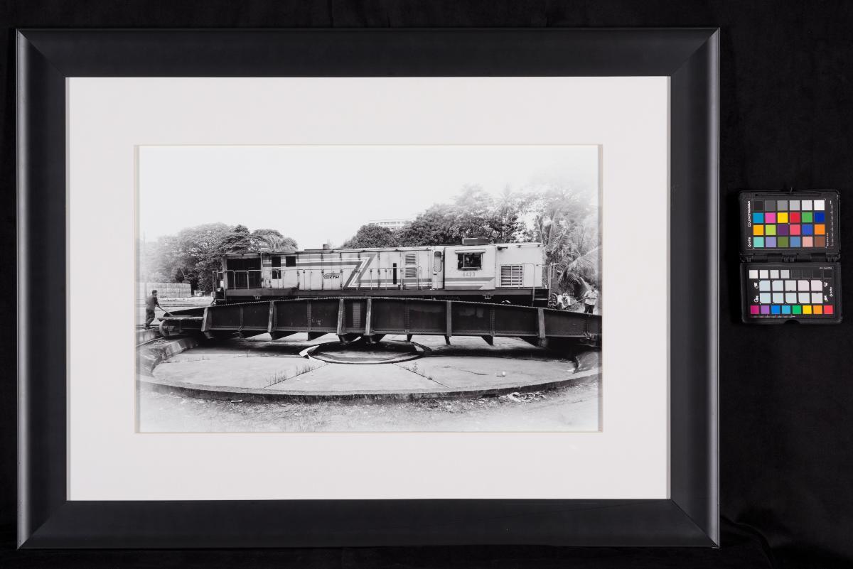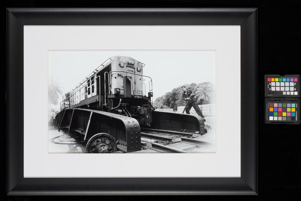 This image shows a worker manually reversing the head of the locomotive on a turntable at the train depot in Blair Road. It is part of the "Tracking Memories" collection by the late Mr Kwek Leng Joo. The collection captures different aspects of the Malayan Railway story in Singapore, documenting an important chapter in the history of Singapore. Some of the works were exhibited at the National Museum of Singapore in 2011, together with the watercolour paintings of Mr Ong Kim Seng.